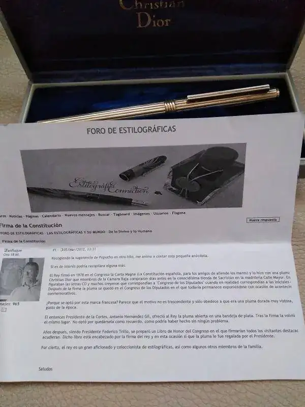 Como curiosidad, con una pluma idéntica a esta se firmó por el entonces rey la Constitución de 1978. Adjunto información tomada de un foro de estilográficas.
