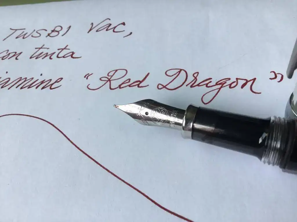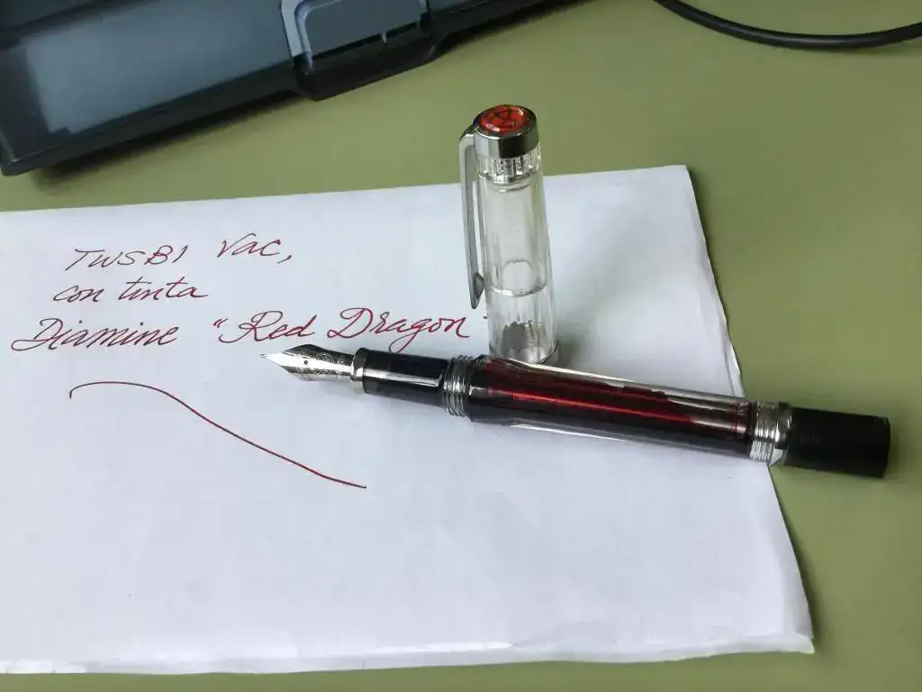 Unas fotos apresuradas de la que llevo encima, en el trabajo, para que no decaiga el hilo (en casa tengo otras seis o siete en danza): una sufrida y aguerrida TWSBI Vac, la primera TWSBI que tengo la suerte de que no se le agriete el plástico. Hela aquí con tinta Red Dragon de Diamine:
