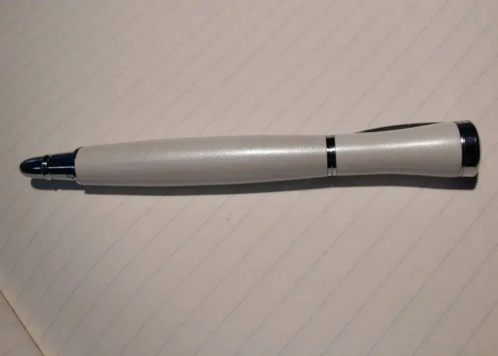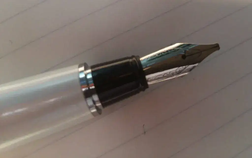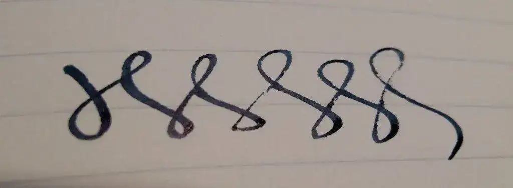 Y la tercera pluma es la que os muestro en las fotos, los únicos datos que vienen son una palabra en el clip (ONLINE) y lo que llama la atención, un plumín caligráfico 1.5, que nunca había visto en estas plumas (tiene toda la pinta de ser china...) Ahí van las fotos y el trazo, en el que se nota que hay que limpiarla