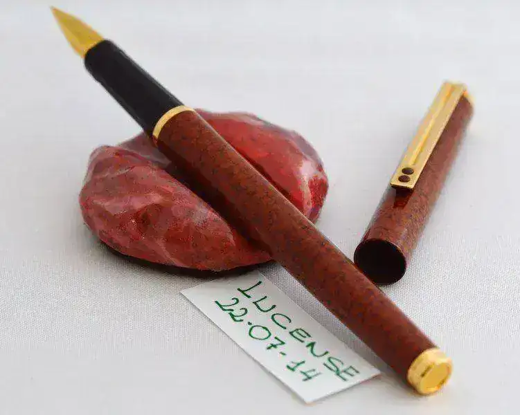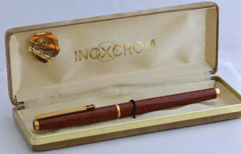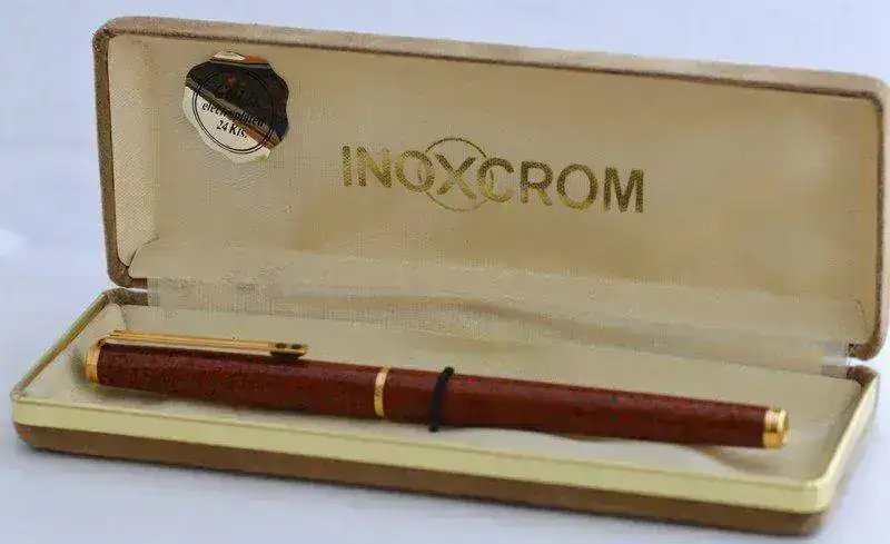 A la venta esta estilográfica INOXCROM 77 "GRANADA" fechada en 1990 .El estado de esta pieza es "NOS" (New Old Stock) , jamás ha sido estrenada , exactamente igual que nueva tal como podéis ver en las fotografías, se acompaña de su estuche original. Plumín de acero dorado y cuerpo lacado con tonalidades marrones. El cuerpo y el capuchón están pintados al horno con acabado moteado (Marbré) . El plumín , el anillo y el tapón son electrodorados en oro de 24Kts. Carga por cartuchos. Su precio es de 30€ gastos de envío incluídos por Correos certificado. Muchas gracias.