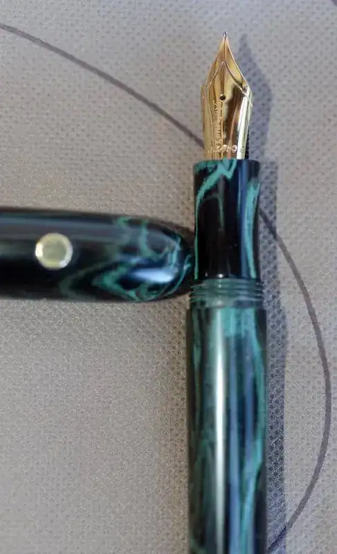 Es una estilográfica de tamaño grande, con plumín tamaño nº 8, de Jowo de 18 Kt., de trazo entre "m" y "b", extremadamente suave. la lenteja es de 6 mm porque de 5 quedaba un pelín pequeña.