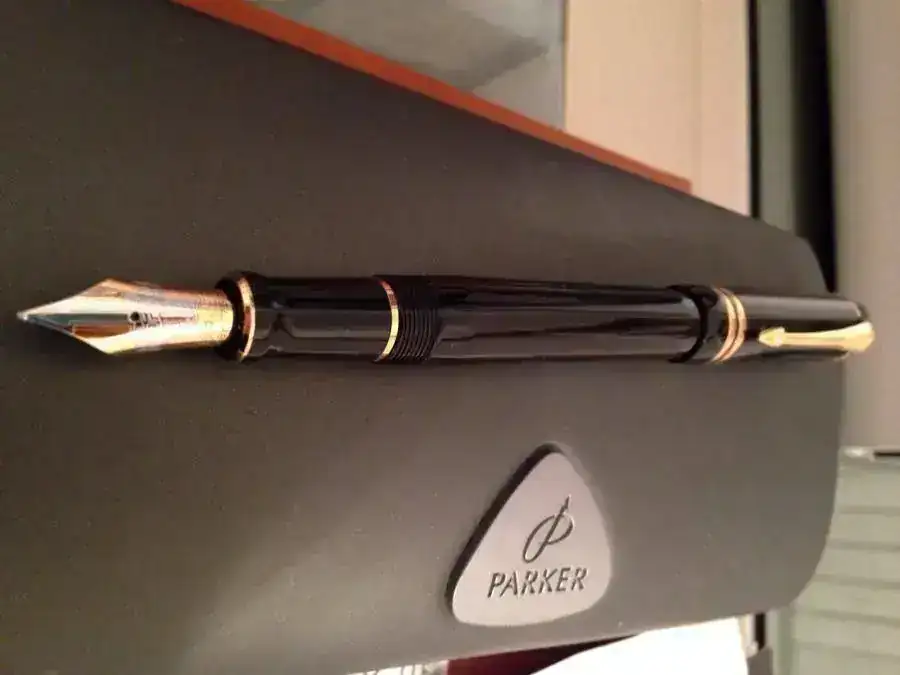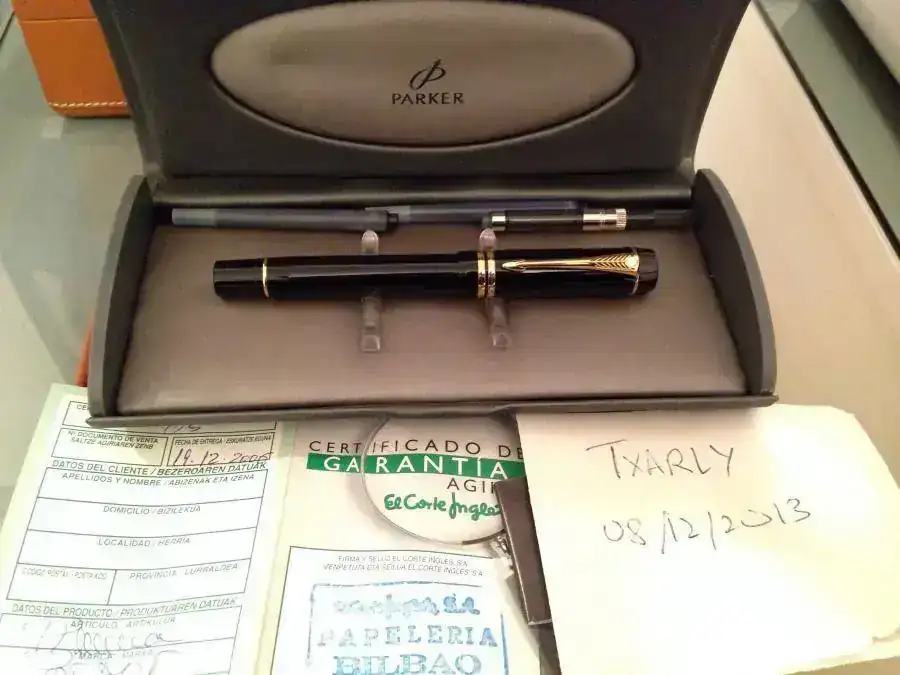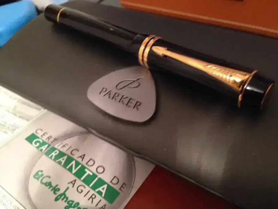 Pluma en resina negra con detalles bañados en oro. Plumin en oro de 18klt de trazo F. sistema de carga por embolo y cartucho. Comprada en el corte ingles, solamente probada, asi que esta como nueva. Con su caja y garantia (ya caducada)