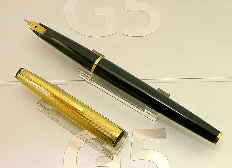 El cuerpo presenta sección y barril de plástico negro liso, con contera realizada en metal macizo con chapado de oro. La unión entre ambas partes lleva un anillo liso dorado que queda oculto bajo el labio del capuchón cuando se cierra.