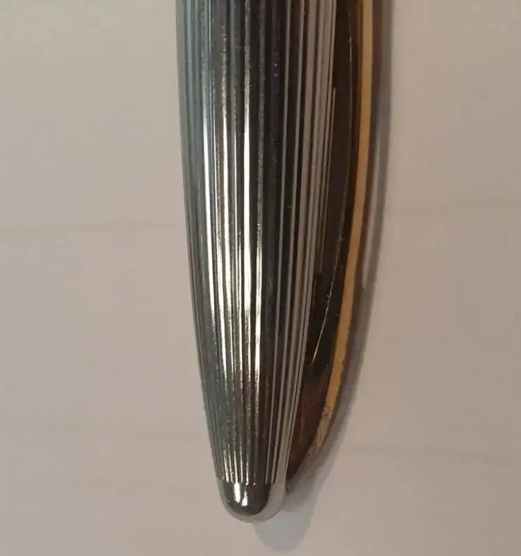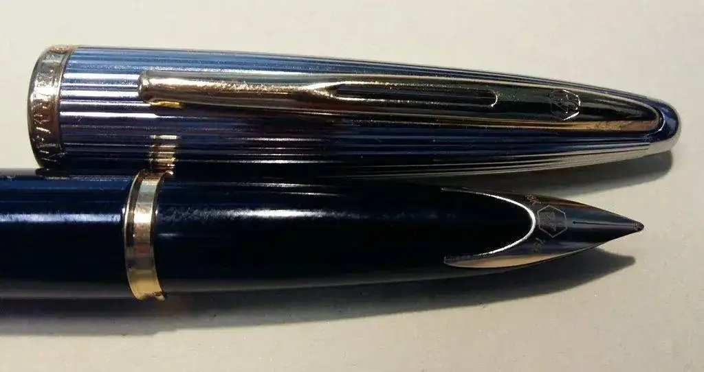 Cuerpo negro y capuchón de plata, con plumín oro 18k en punto M.