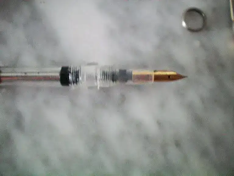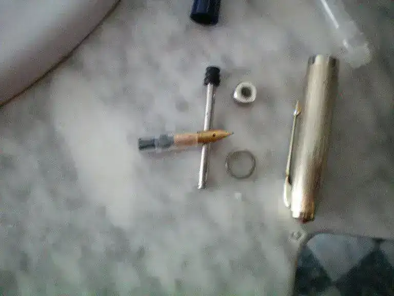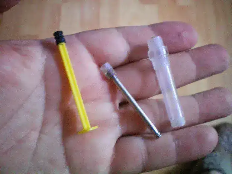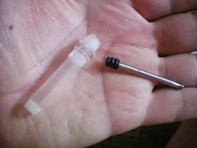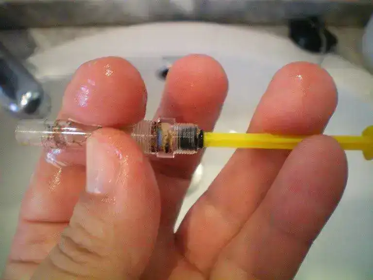 La pieza amarilla y negra que se ve es el émbolo de una pequeña jeringuilla que he utilizado para retirar la costra sin rallar el interior del cilindro, tras un laaargo e interminable coito
