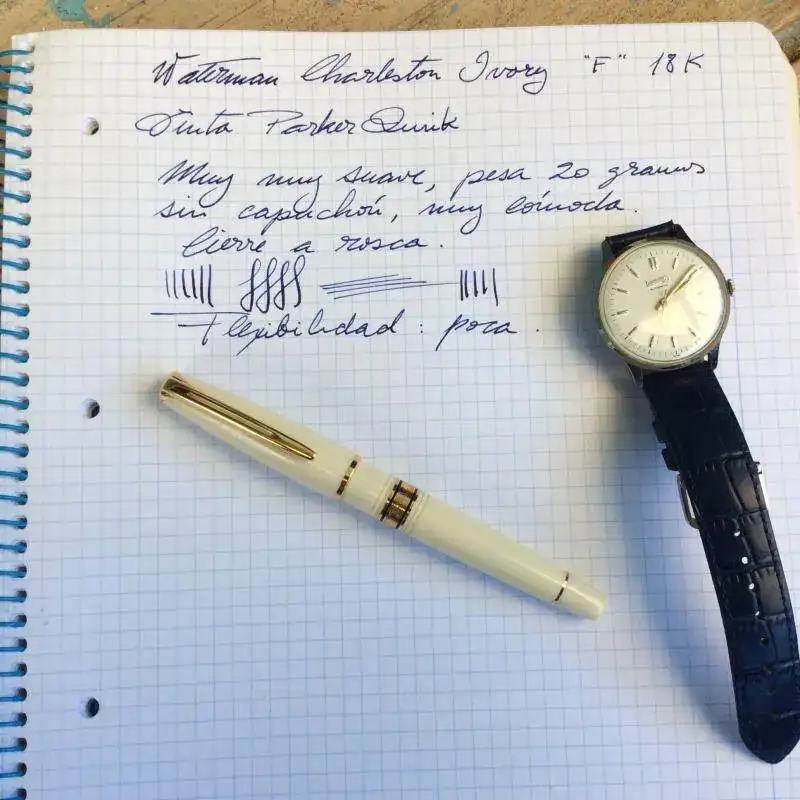 Una antigua Waterman 5, cinta y punta verde, a estas alturas, una estilográfica no muy corriente.