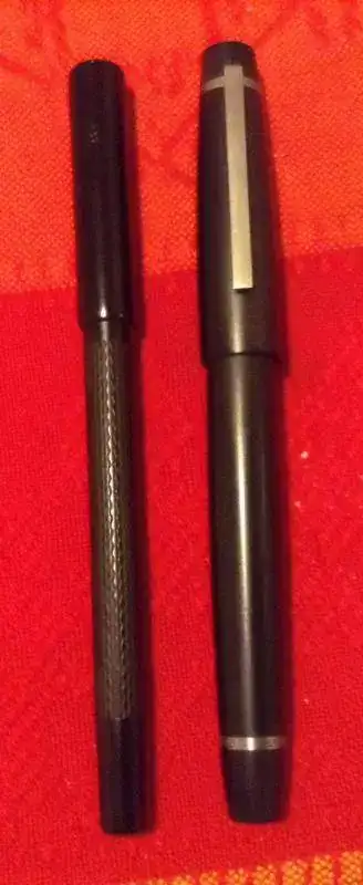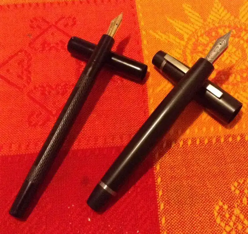 Una hecha por Gabriel Clavijo en ebonita y plumín de oro. Es de las plumas que mejor escriben de las que tengo, hace nada se ha vendido una parecida en el foro de compra venta a un precio tirado.¿Cuál es la de la derecha? Un saludo!