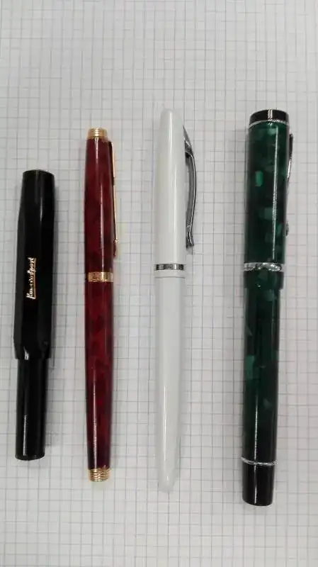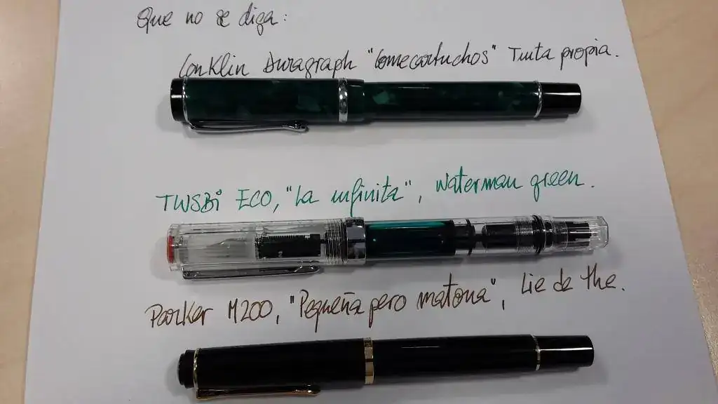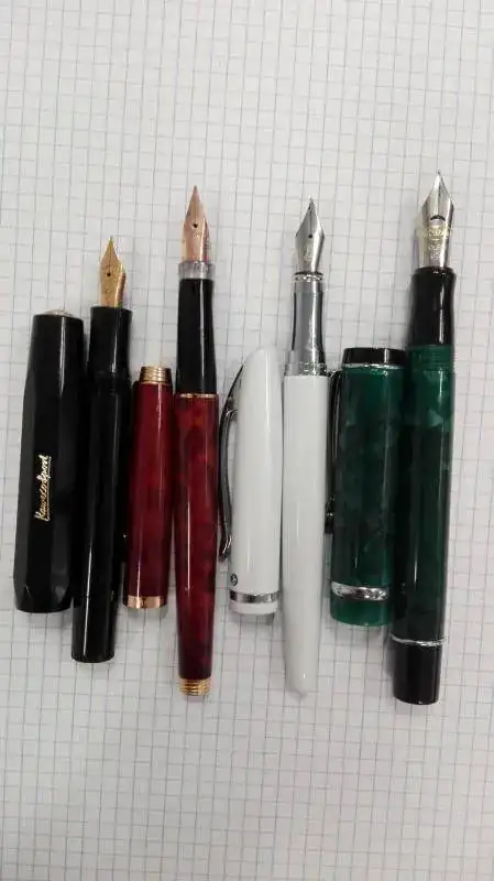Las plumas de la semana son estas: La primera y la de uso diario una Waterman Liaison en ebonita marrón y punto F, para disfrutar en casa, una Omas Extra Arco Grey Platinum lined de 1938 punto F Flex, muy flex. y una Pelikan 500Nn, en OM, y su compañera 800 en plumín F, tintas Diamine, Private Reserve Aguacate y como no J. Herbin Perle Noire, un saludo. Una atención al plumín de la Omas marcado extra lucens cuya parte delantera parece embutida en el resto del plumín más grueso lo que hace que el cambio de trazo sea indescriptible.