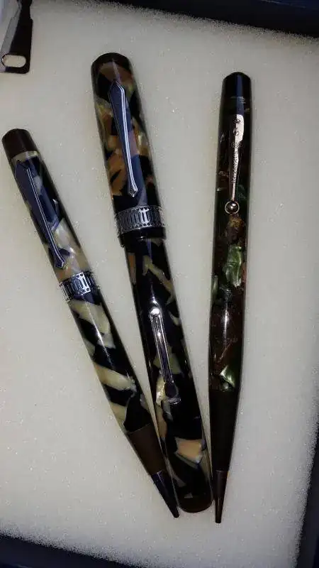 Pues las plumas de la semana, son tres y los Pencil otros tres por si hay sorpresas de fallos, tod@s ellos muy Vintage, La Primera es una Waterman Patricia con su Pencil Pearl and Black y un Pencil Patricia al que llaman Brasileño, por sus tonos de Jaspeado verdoso y que lamentablemente no he podido plasmar en la foto todos ellos datados sobre 1.929. Las otras dos son dos Wahl Eversharp,