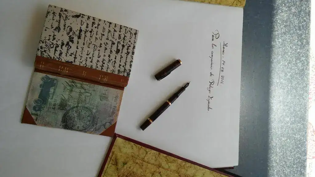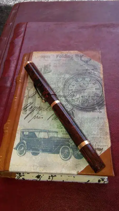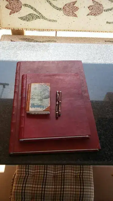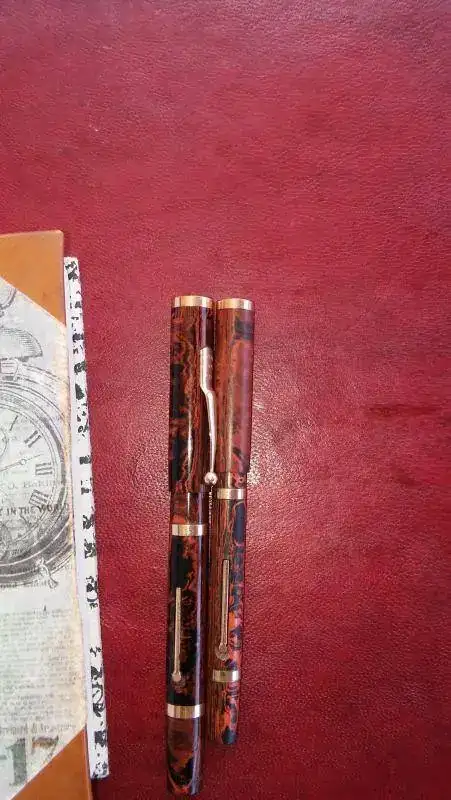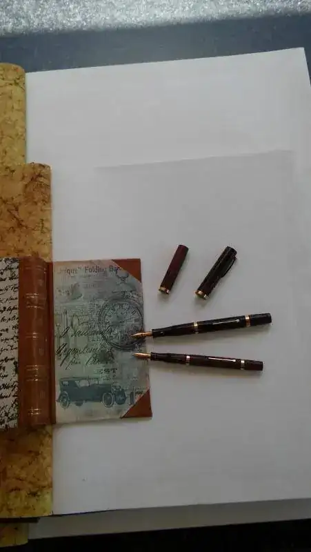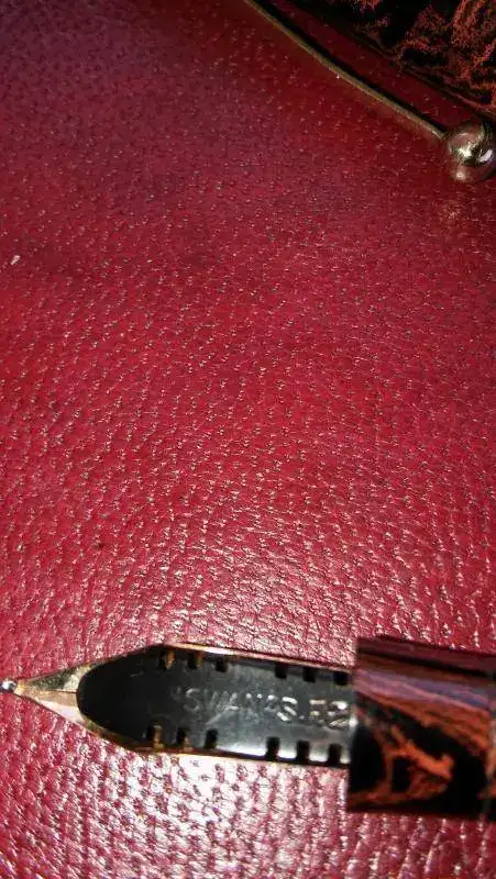 Tras unos días de asueto en Llanes; donde me he podido agenciar tres cuadernos de piel, he entintado un par de estilográficas Swan Mabie Todd, en ebonita jaspeada que imita muy bien la madera y que guardo en perfecto estado de revista. Unas fotillos de las plumas y cuadernos (el grande mide 51 cm por 36).
