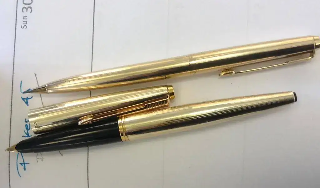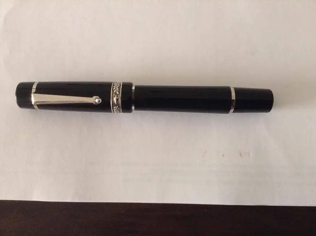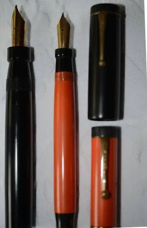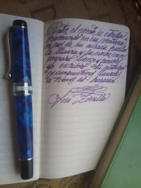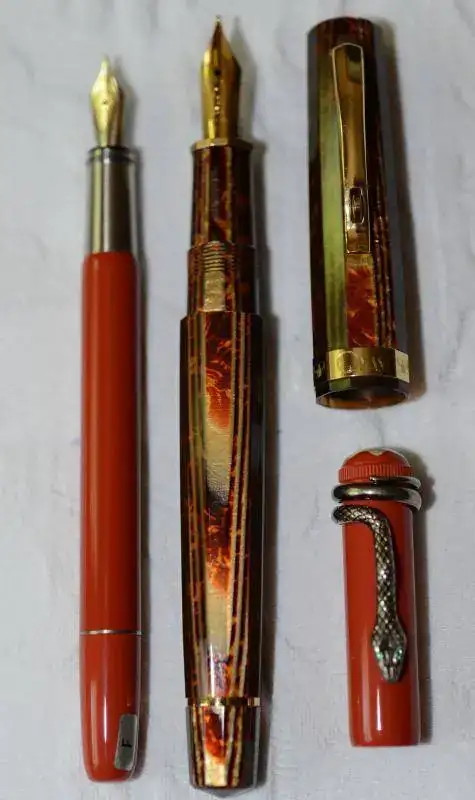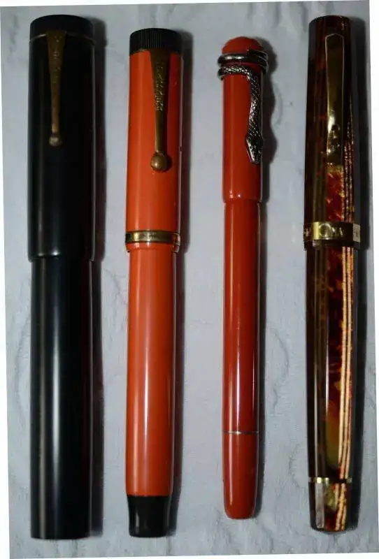 De entrada una Parker Duofold Lucky Curve en color negro. Es la más grande de las fabricadas por Parker: carga por cuentagotas, plumín "m" muy flexible, y cuentan que en la época de la Ley Seca del senador Andrew Volstead, los devotos llevaban cargados de licor esta estilográfica, u otras semejantes, como la W 58 y la W 20, para sus posteriores libaciones. Como elemento comparativo, he situado una Parker Duofold en ebonita roja a su lado, que también usaré esta semana; finalmente nos encontramos para ir tirando es estos días, una MB rouge et Noire moderna, color rojo, y una OMAS de precioso celuloide, plumín semiflexible "m"