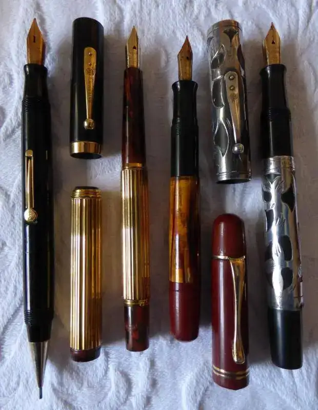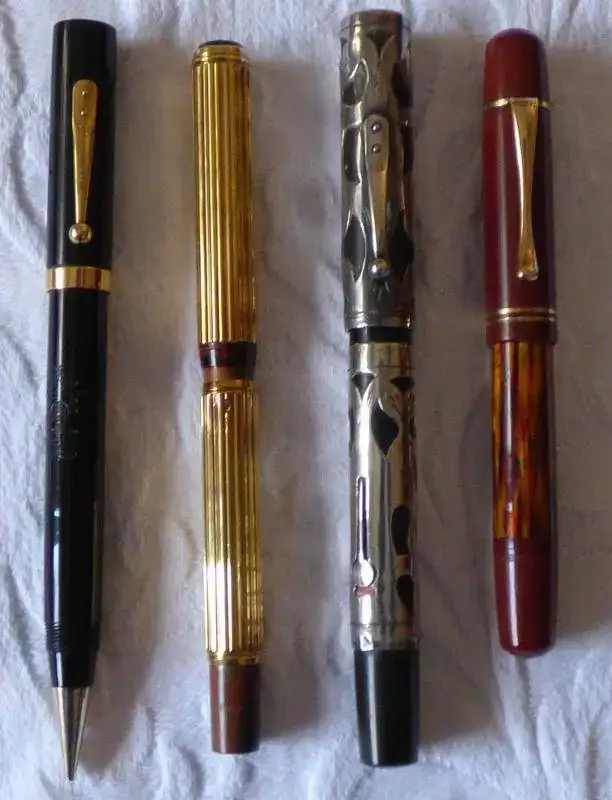 De izquierda a derecha: uno de los poco habituales combos de Waterman´s, especialidad en la que no se prodigó; a continuación, una Waterman´s 14 con camisa de oro bajo; seguimos con una Waterman 55 con camisa de plata, y finalmente, una Pelikan 101 NN tortuga.
