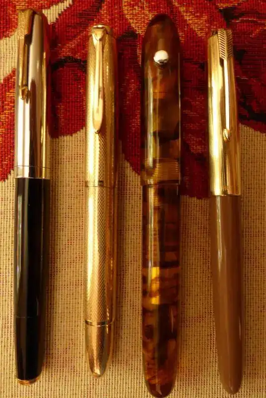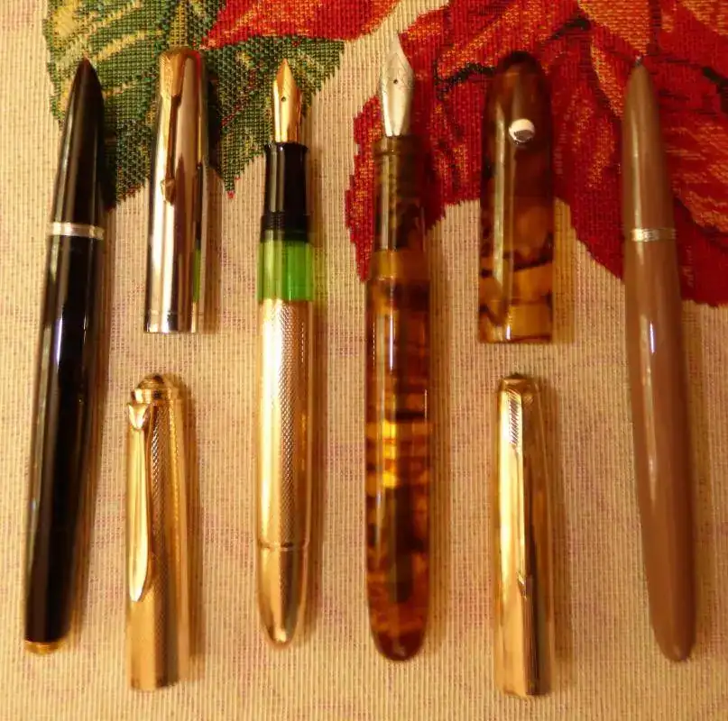 Pues aquí tenéis una Parker 51 en buen estado, que ha sido la de la semana, una Pelikan, una Antigua´s en bonita resina transparente, expropiada sin justi ni injusti precio por mi MDD y otra Parker 51.