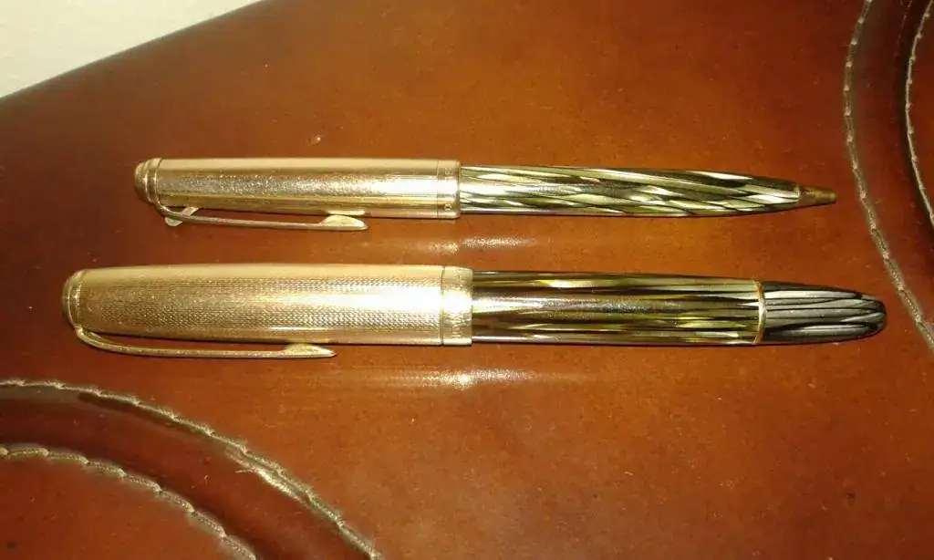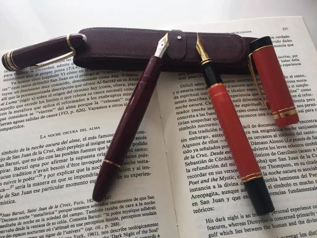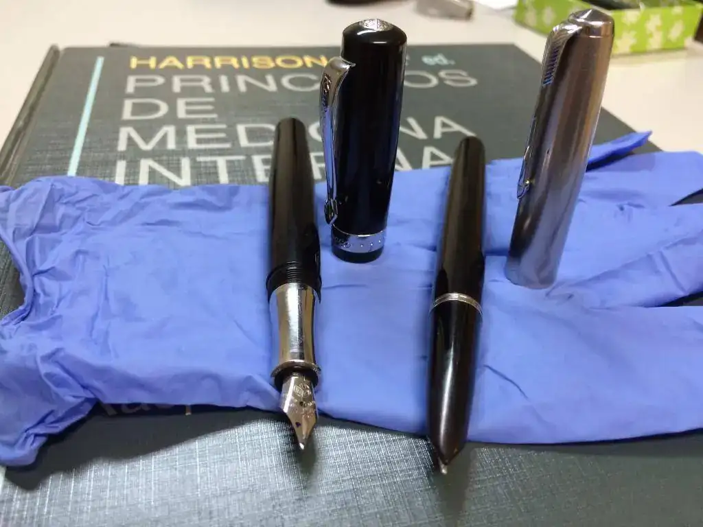 2 estilográficas Chilton´s de la primera mitad de la década de 1920; la negra en tamaño máximo; y luego una MB 234 1/2 y una MB 146 cubierta de cicatrices tras décadas de sacrificado servicio.