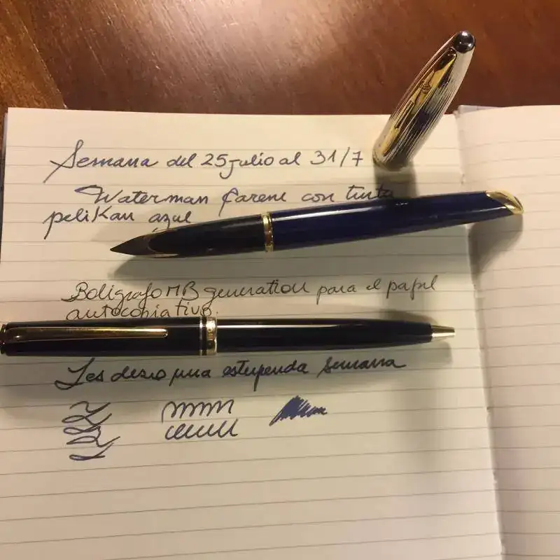 Saludando desde Chile, con mi Waterman Carene azul, que tengo desde hace 11 años cuando me la dio mi madre al titularme de médico, asi que tiene un gran valor sentimental. Y para los incontables papeles autocopiados mi primer MB de hace ya varios años, un bolígrafo generation.