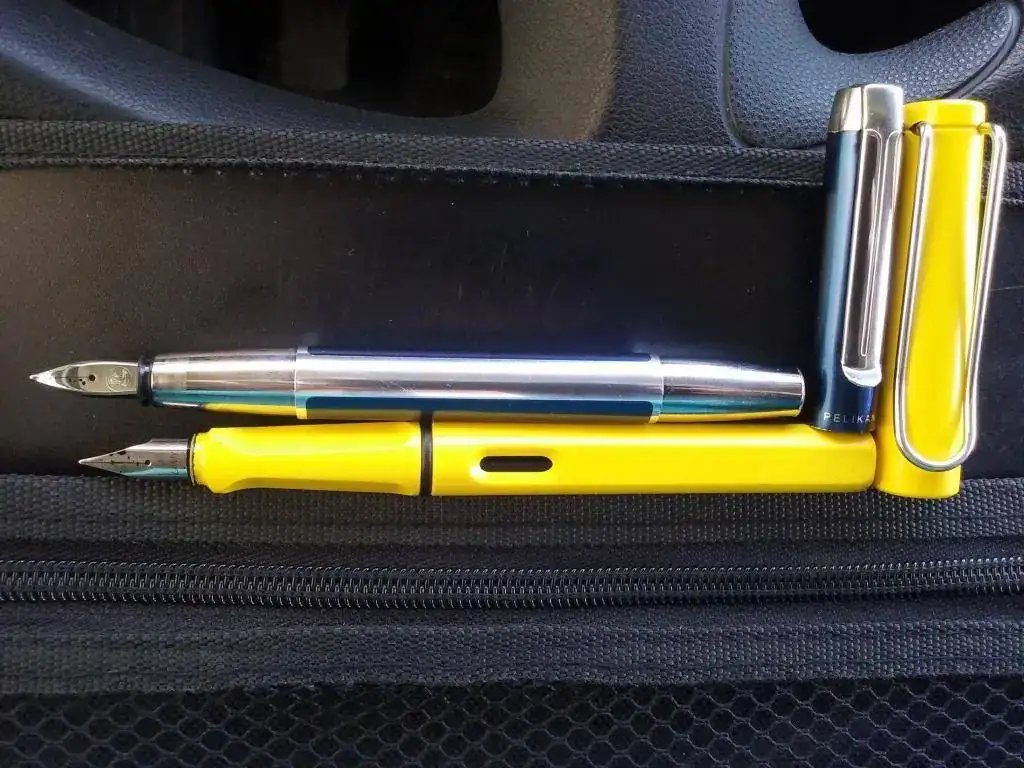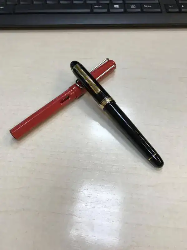 Una pequeña Montblanc Safety nº 0 con punta OM, junto a una Swan Blackbird en bonito celuloide.