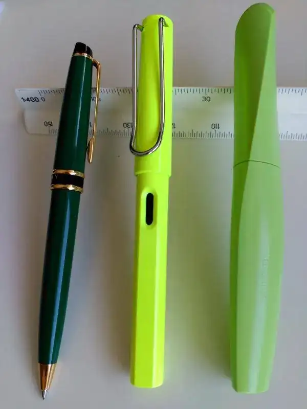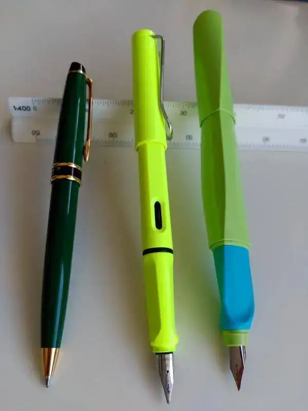 Por cierto, como comentaba Miwesly en su presentación, la Wing Sung hace pequeña a la Jinhao. Pero como es de plástico, pesa mucho menos, y es más cómoda para tiradas largas. Otra foto para que veáis mejor los tamaños: