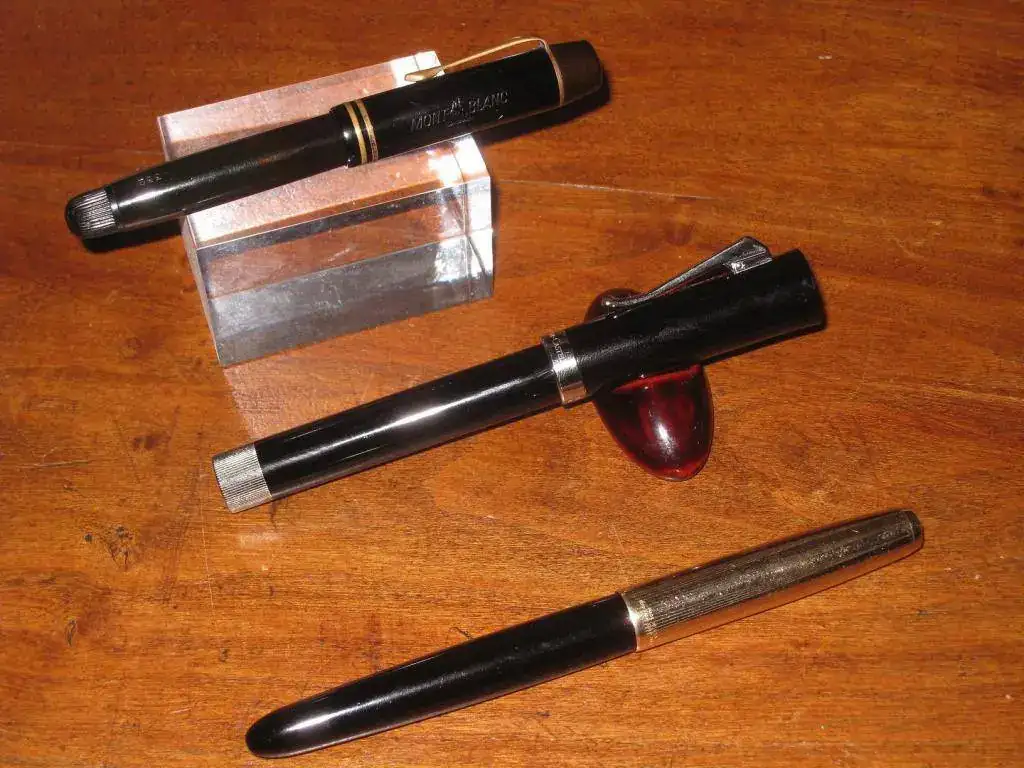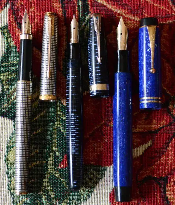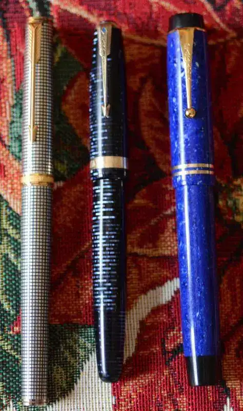 Parker 75 en plata, que llevaba algunos decenios guardada, Parker Vacumatic azulada y una Parker Duofold en bonito color azul.
