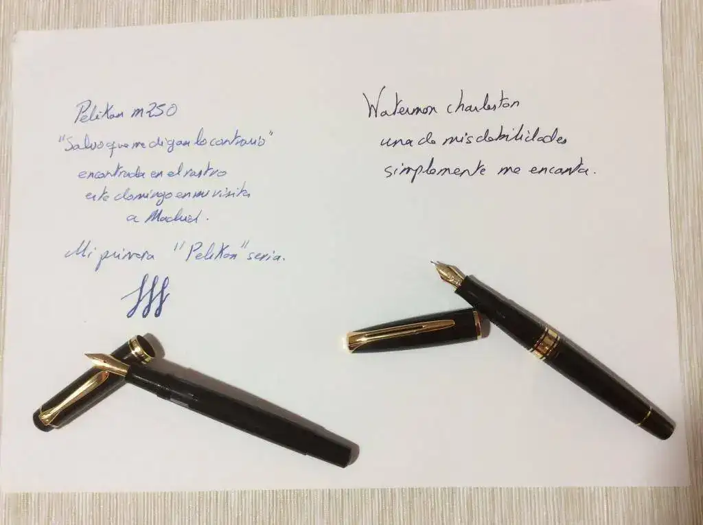 Esta semana ando con estas dos, una, una agradable sorpresa de mi visita a Madrid, otra, una debilidad. Una con tinta Pelikan azul real y otra con cartucho Waterman.