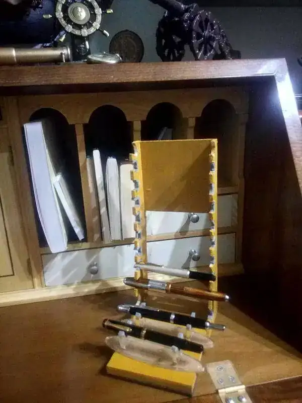 Quinto elemento para la P, una "poyata" que hice para las plumas -sí, aquí la P del sustantivo igual ya es un poco forzada...-. Sencilla construcción pero eficaz para ganar espacio y tener todo a mano, porque me empezaba a cansar de desenfundar los instrumentos de una lona de cuero .