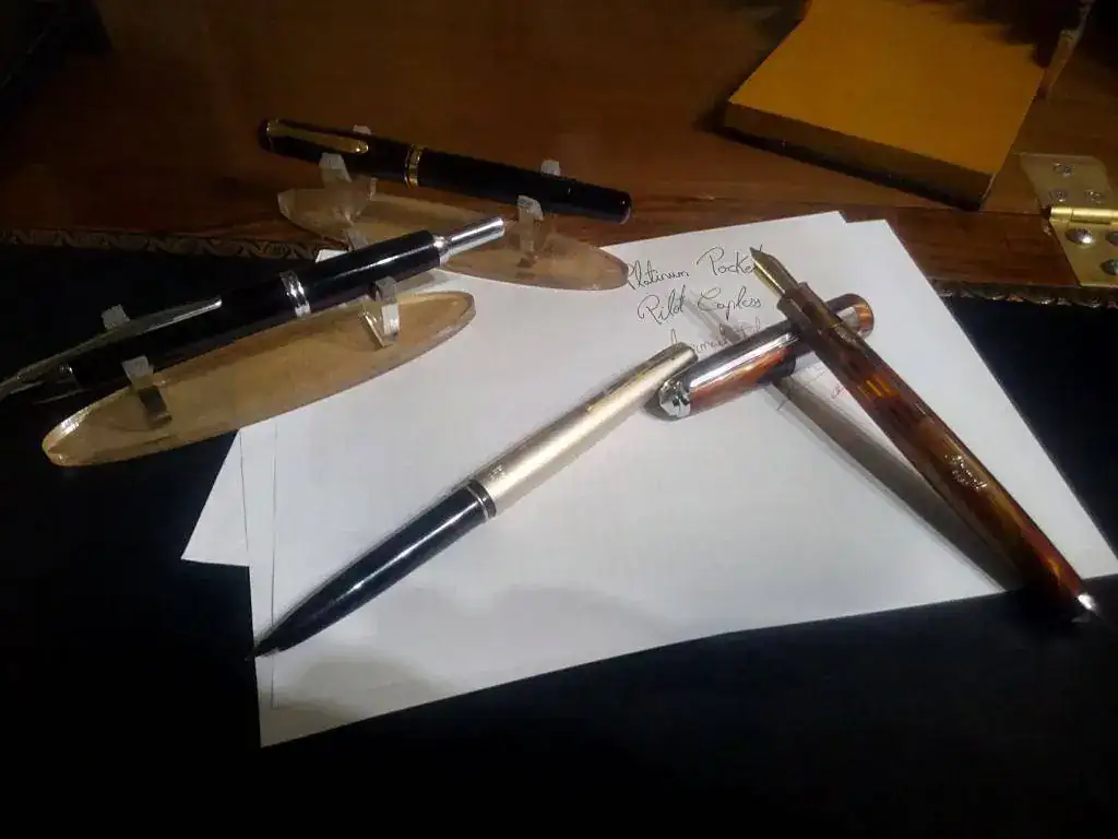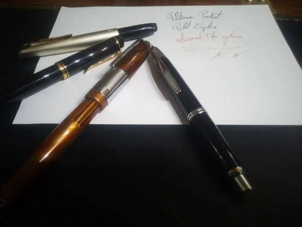 Pelikan, Platinum Pocket, Pilot Capless y... Puñetera india de carga a cuentagotas (bautizo de fuego con Diamine Shimmer Inferno Orange; que no sea nada...). De uso ya veremos en próximos días, pero había leído que estos plumines rascaban y, de momento, me ha sorprendido su trazo y finura.