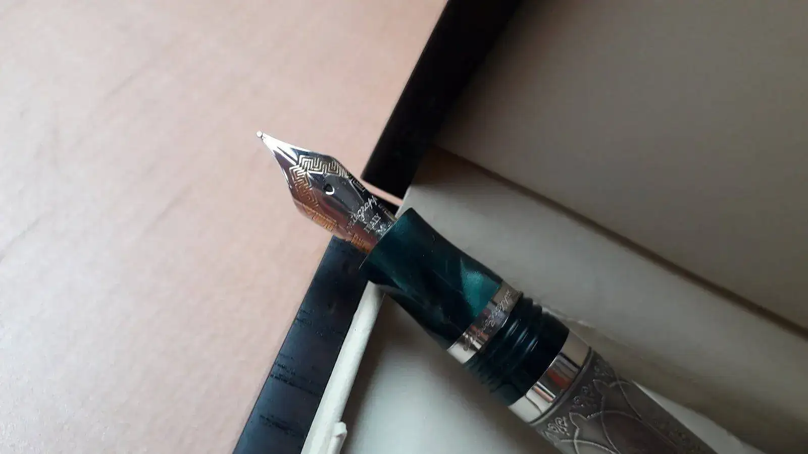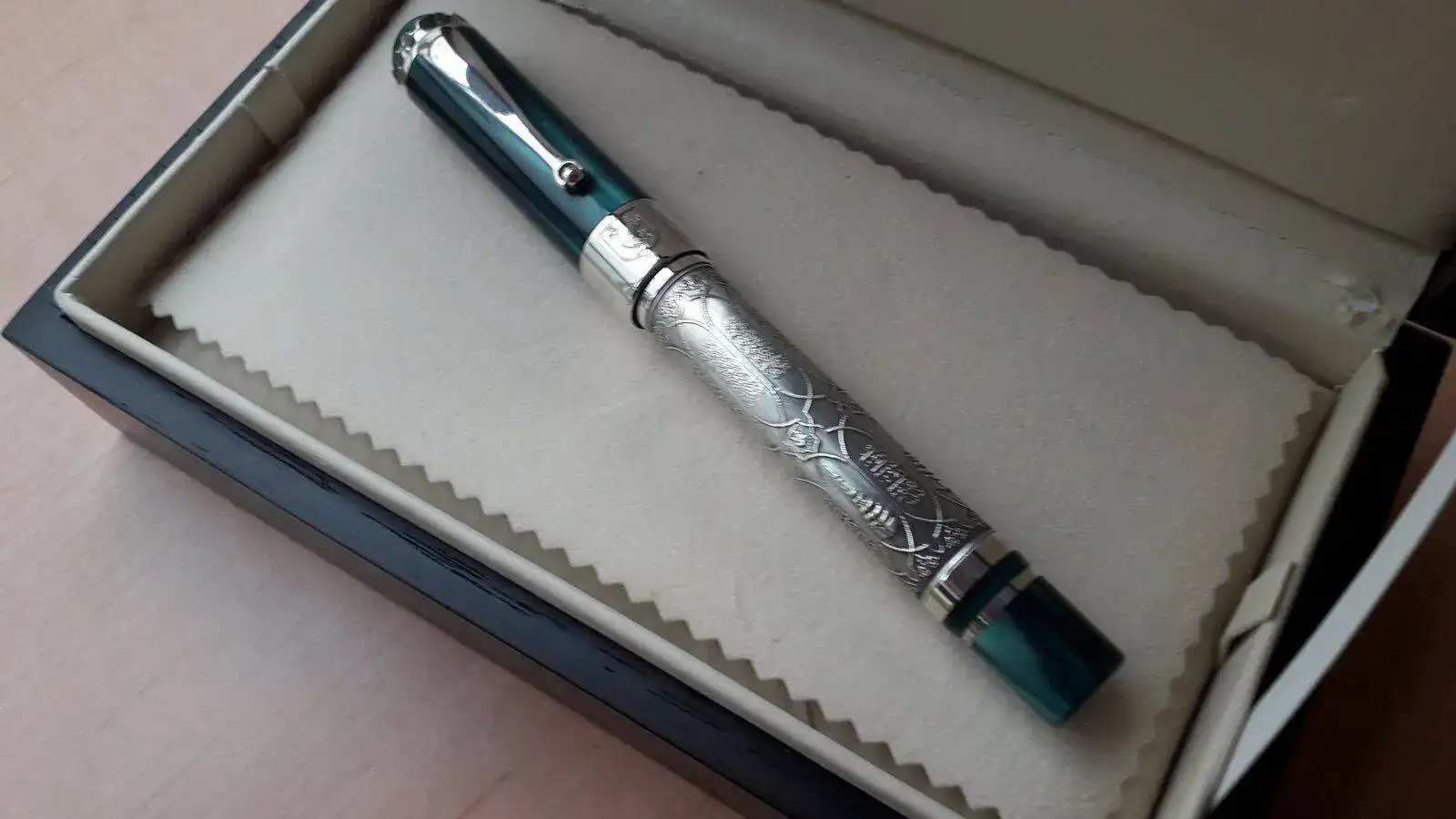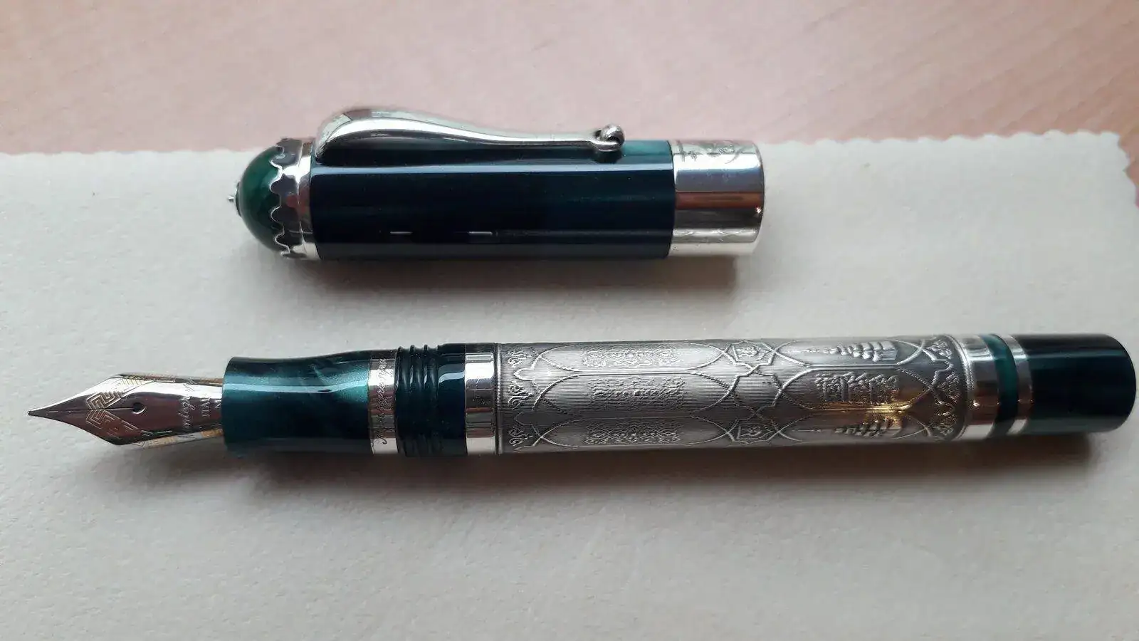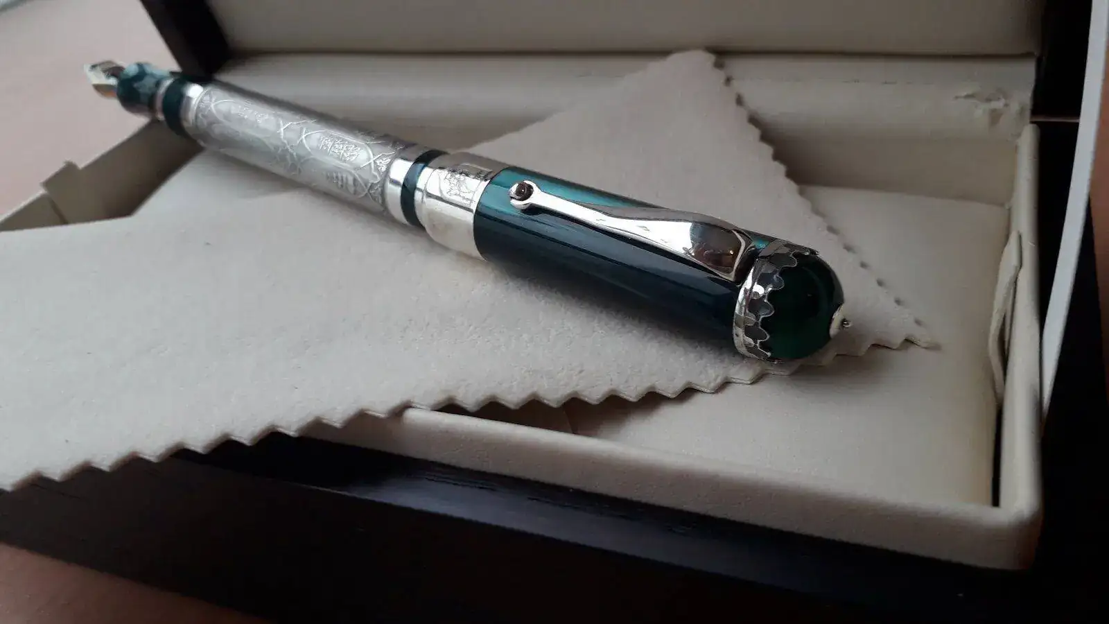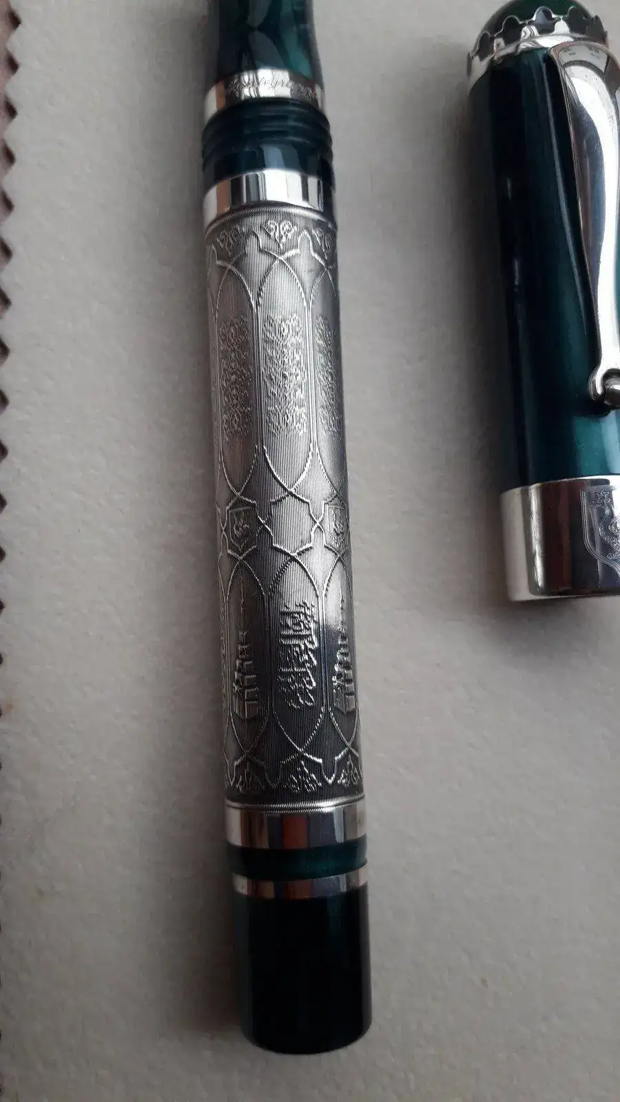 Se vende pluma Estilográfica serie limitada Kazan en honor a esta ciudad milenaria cuna del pueblo Tartaro ....Como sabéis esta Estilográfica es espectacular, construida en plata trabajada de manera artesanal y resina verde preciosa...es una pieza espectacular y escasa ya que solamente se han fabricado 500 piezas para todo el mundo siendo esta la número 349....la Estilografica no se ha utilizado nunca como mucho solo probada en modo palillero para comprobar el trazo...El estado de la pieza es excelente..