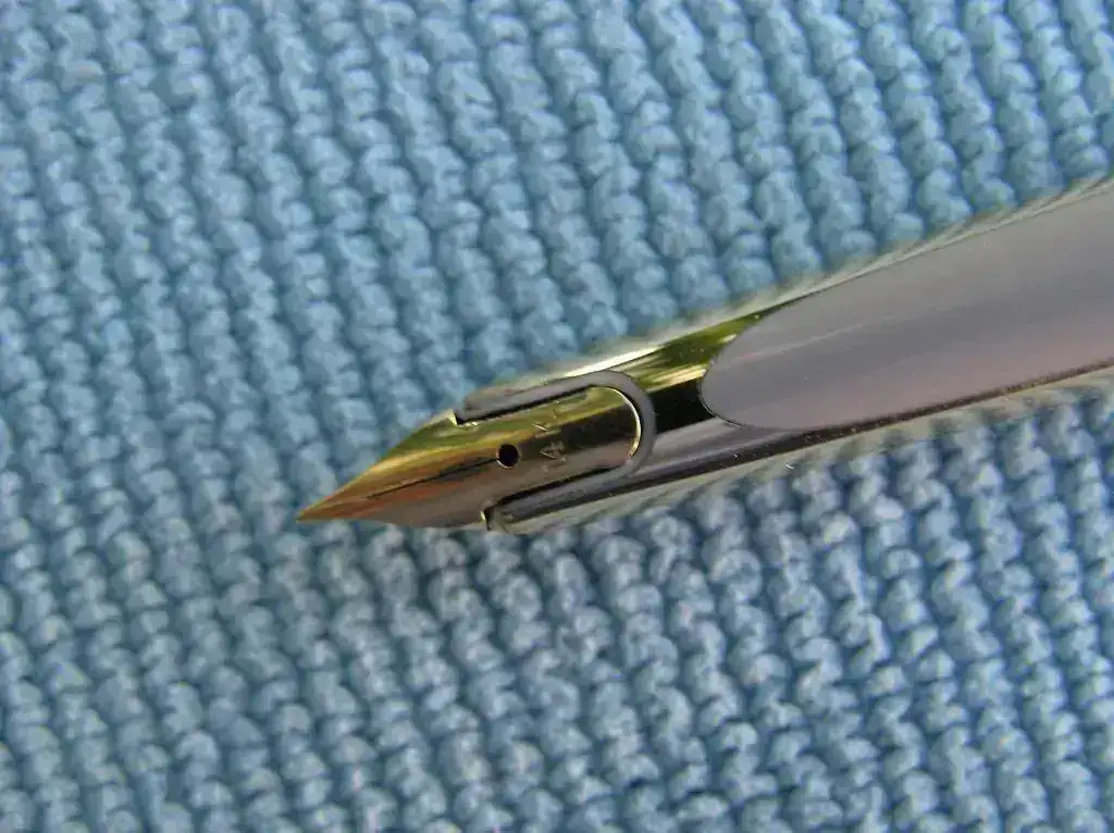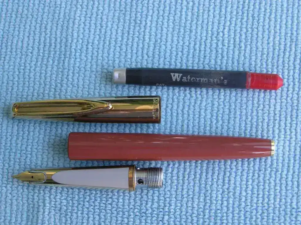 El plumín es de oro, de grosor medio/ancho y lleva la inscripción “14 K”. Este modelo es el llamado “CF”, iniciales que responden a CARDTRIDGE FILLER, (carga de cartucho), pues fue el primer modelo de “WATERMAN”que utilizaba cartuchos de tinta.