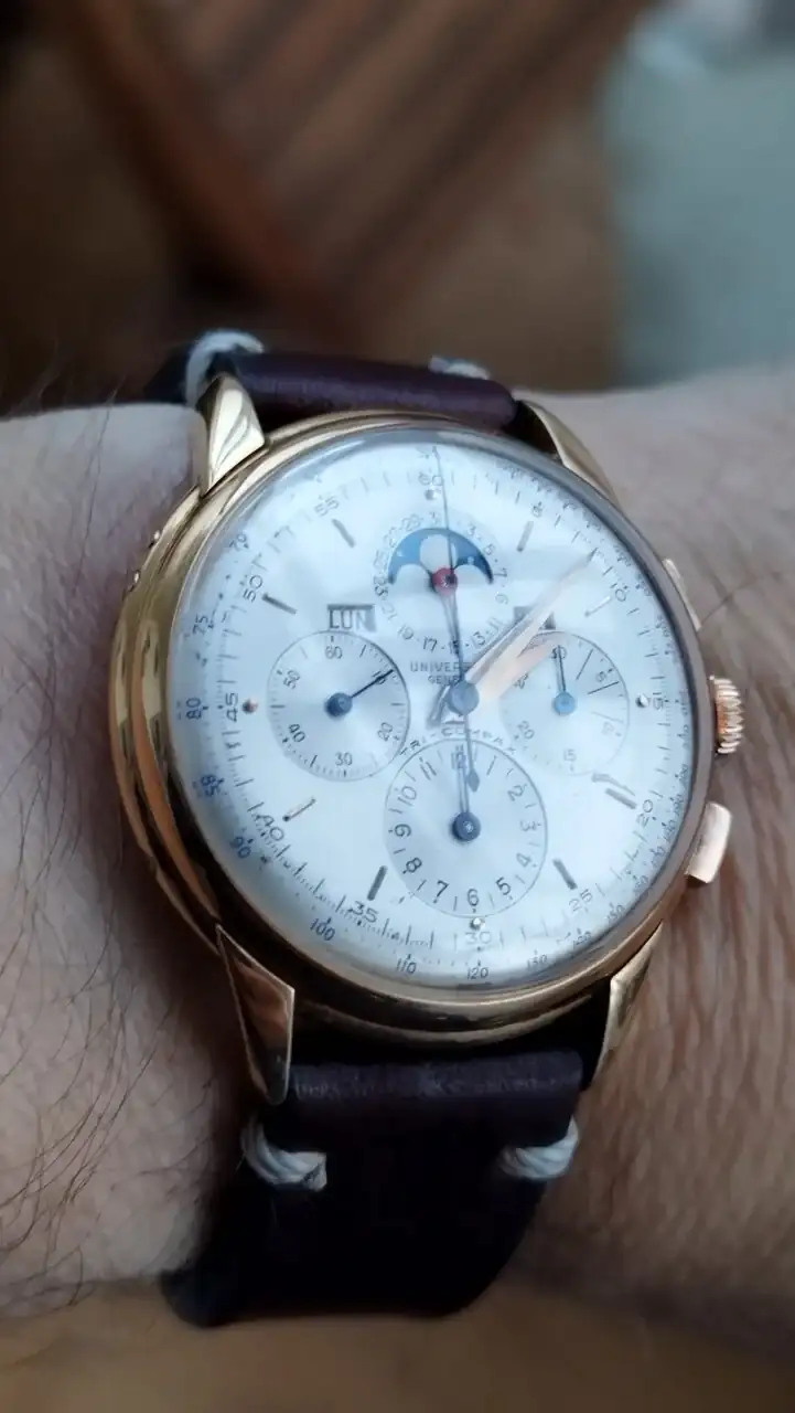 Años 60: «la modista de los relojes» – La marca volvió a lanzar con éxito su serie Compax en forma de relojes deportivos, que incluía el favorito de los coleccionistas, el cronógrafo «Nina Rindt», y el calendario completo Tri-Compax «Eric Clapton», apodados así por sus famosos usuarios. En 1966, Universal Genève lanzó el movimiento automático más plano del mundo en su Golden Shadow.