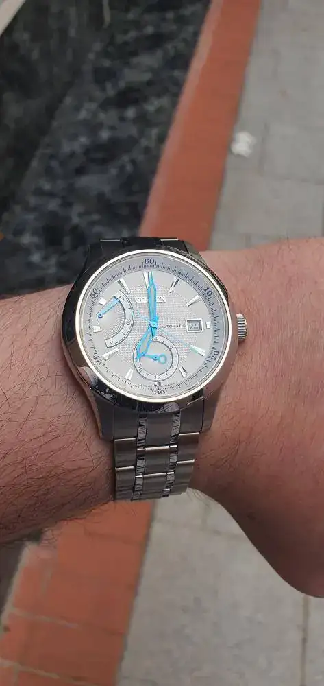 El tamaño de la caja son 43mm de diámetro, equipa un calibre Miyota 9184 con reserva de marcha de 40 horas, que además en este modelo cuenta con un indicador de reserva de marcha. Tiene un rotor decorado con 26 joyas que en su tapa trasera de cristal se puede admirar, está construido en caja de acero inoxidable con carátula en gris metálico y fechador, manecillas luminiscentes y cristal de zafiro antirreflejante además de tener una subesfera de 24 horas.