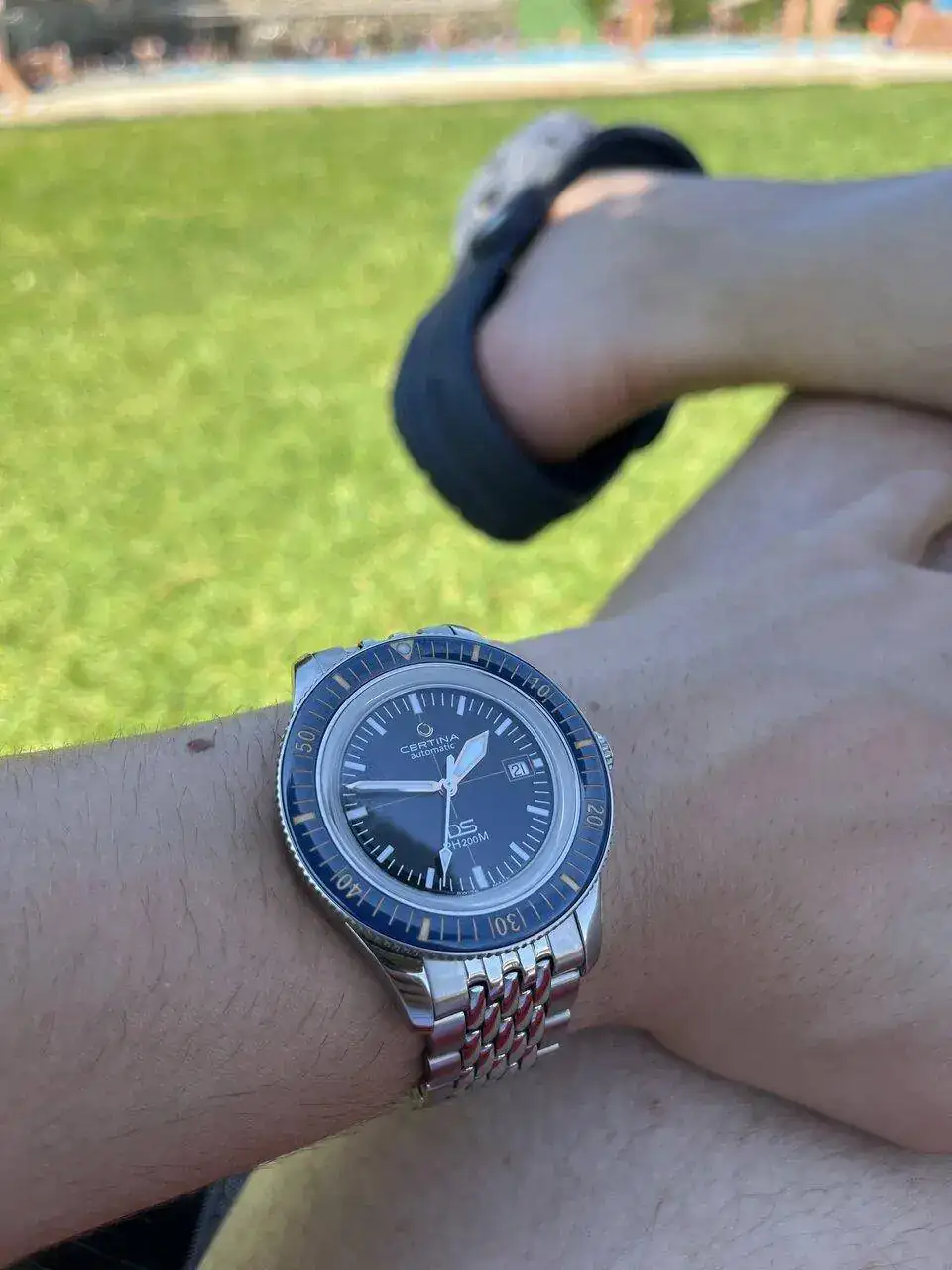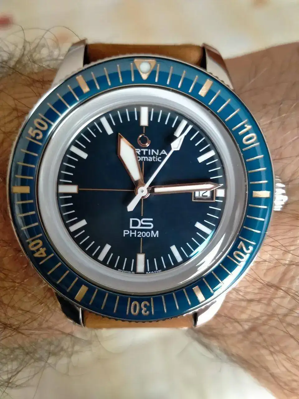 Al grano ... con mi precario presupuesto he adquirido este fantástico CERTINA PH200 con bisel de cerámica. Me parece un reloj que reúne la mayoría de lo que personalmente buscaba. Estética vintage (el formato de su cristal y ese espacio blanco entre el bisel y el dial), aire deportivo (su color azul del bisel y la esfera azul marino, casi negro en contraste con los índices en blanco) y elegante al mismo tiempo (las agujas, el logo de la marca y los indicativos del bisel con acabado en dorado), la mejor legibilidad tanto de día como de noche (dispone de un lumen que dura toda la noche y el segundero blanco es un acierto absoluto). En referencia a la corona decir que me agrada más la estética sin los protectores y que me parece admirable la hermeticidad de 200m sin ella. Con respecto al datario me hubiera gustado más su ausencia, pero me parece que está estupendamente resuelto con el cerco dorado de la cruz, también dorada, que rodea los índices principales. En cuanto a la correa, tenía dudas entre esta y la Nato ... al final me ha parecido que le "pega" más a la filosofía de lo que buscaba la de piel, además de tener un tacto que me agrada. De la mecánica lo poco que puedo decir es que ya dispongo de un Powermatic 80(este tiene la espiral Nivachron) y va de maravilla, a parte de que con el tiempo es más evidente que tiene calidad y va ganando terreno. Por poner un pero a todo lo que es el reloj no sé si hubiera sido más acertado por parte de la marca dotarlo de un cierre de mariposa. Tengo otro CERTINA con ese tipo de cierre y me resulta bastante cómodo aunque no es de los mejores que existen.