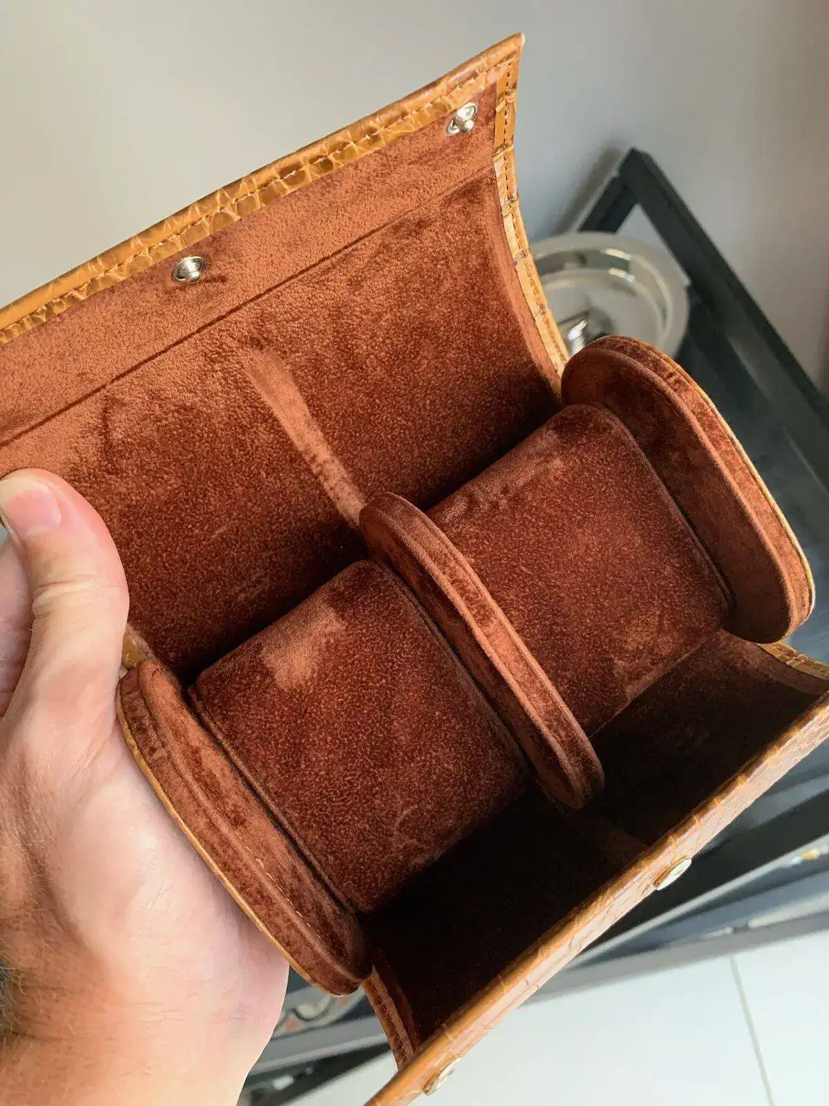 Busco un estuche de viaje de piel y cilíndrico para 3 relojes a un precio razonable.