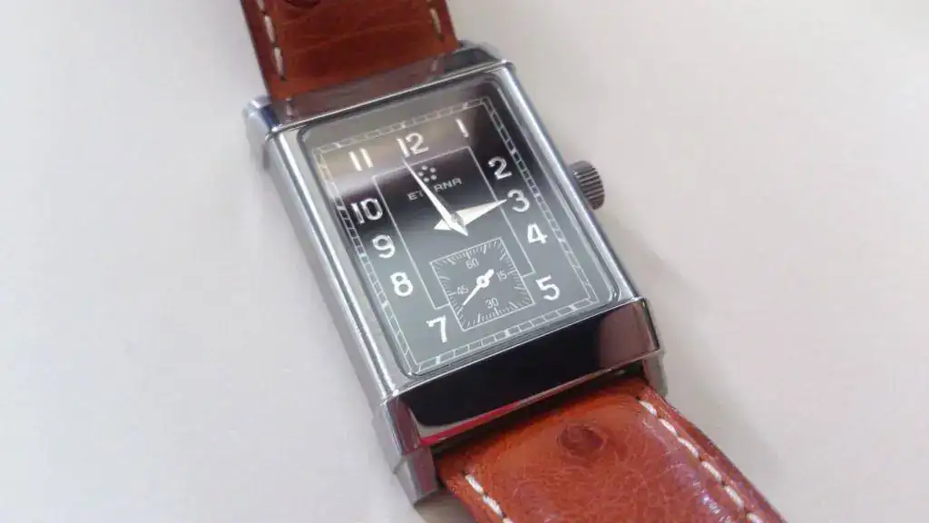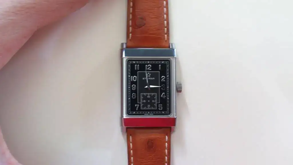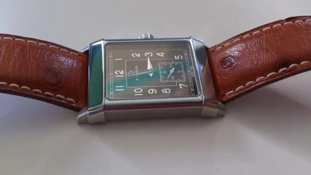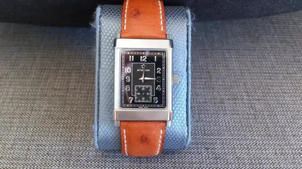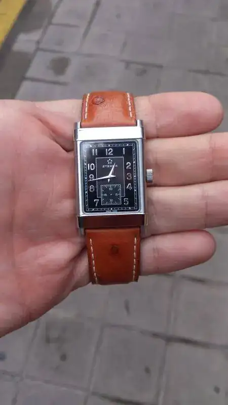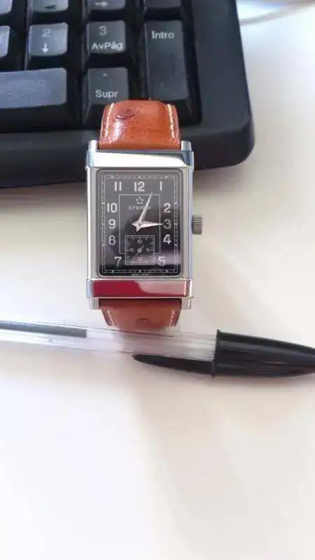 Vendo este elegantísmo reloj rectangular de la mítica casa suiza Eterna. Caja de acero y cristal de zafiro en magníficas condiciones. Bueno, el cristal está perfecto al 100% bajo mi punto de vista. La caja, con zonas cepillas y pulidas, tiene pocos y leves pelillos poco apreciables. La correa, original Eterna, de piel de avestruz, aunque es muy bonita y le queda mucha vida por delante, sí se nota usada. Corona, hebilla y tapa trasera firmadas. Su movimiento es un suizo, robusto, preciso y fiable ETA 980.163 de 15 rubíes. 30m WR. La esfera es de color negro oscuro por el exterior y gris oscuro tanto el rectángulo interior como el subdial de los segundos. Índices numéricos aplicados plateados, como las agujas, tipo dauphine.