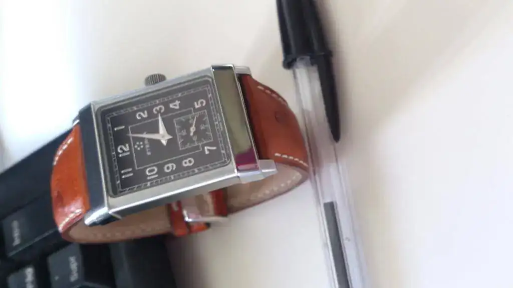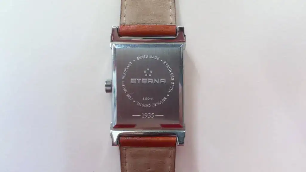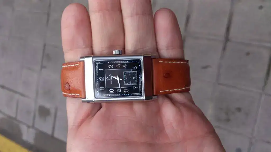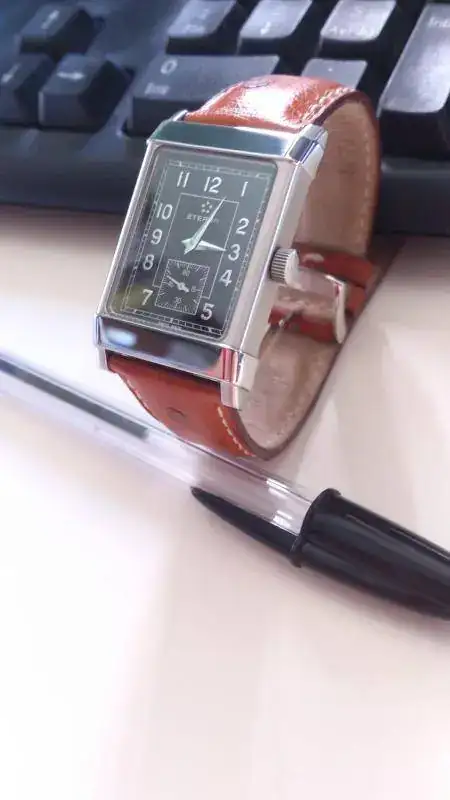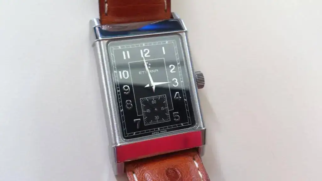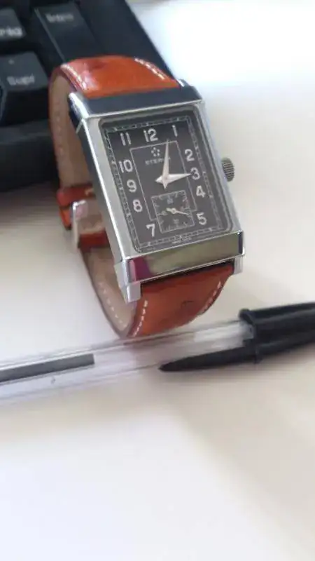 Vendo este elegantísmo reloj rectangular de la mítica casa suiza Eterna. Caja de acero y cristal de zafiro en magníficas condiciones. Bueno, el cristal está perfecto al 100% bajo mi punto de vista. La caja, con zonas cepillas y pulidas, tiene pocos y leves pelillos poco apreciables. La correa, original Eterna, de piel de avestruz, aunque es muy bonita y le queda mucha vida por delante, sí se nota usada. Corona, hebilla y tapa trasera firmadas. Su movimiento es un suizo, robusto, preciso y fiable ETA 980.163 de 15 rubíes. 30m WR. La esfera es de color negro oscuro por el exterior y gris oscuro tanto el rectángulo interior como el subdial de los segundos. Índices numéricos aplicados plateados, como las agujas, tipo dauphine.