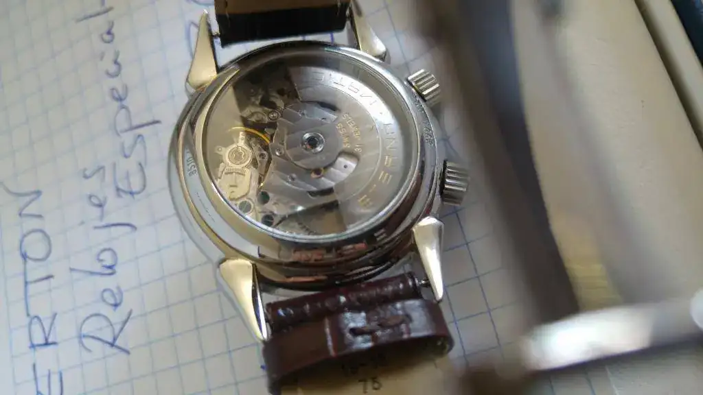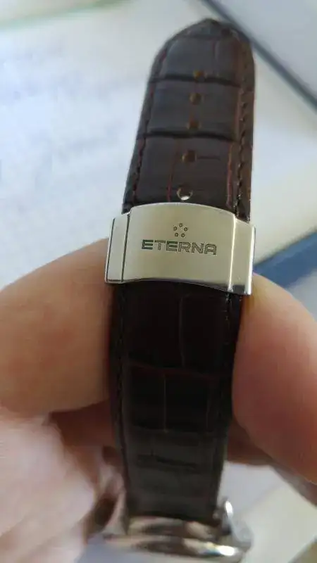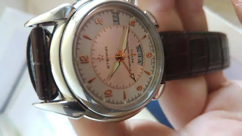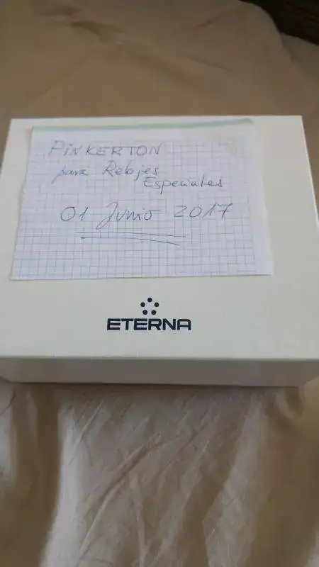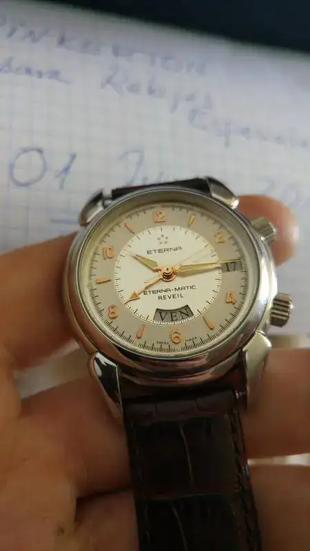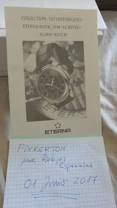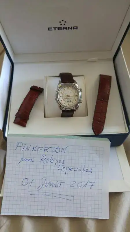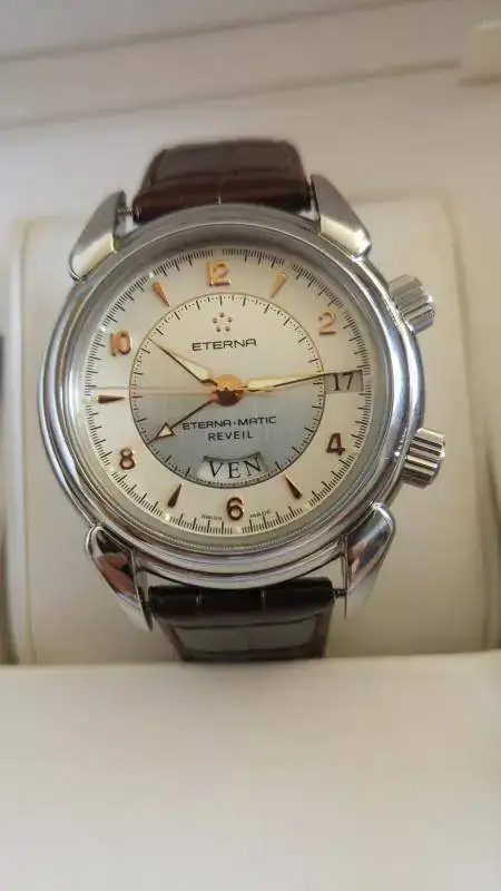 Vendo este maravillosa Eterna 1948 Reveil, me lo he puesto 6 o 7 veces en 2 años, está prácticamente nuevo aunque ya no tenga garantía vigente. La caja está impoluta, sin los típìcos "pelillos" en el acero y la marcha es perfecta, tiene 42 horas de marcha, volante Glucydur a 28800 alternancias, 31 rubís y movimiento Eterna calibre 680 el cual consta de 154 partes, con un diámetro de 30,40 mm y un grosor de 7,60 mm. Tornillos azules, sistema Incabloc y protección antimagnética (no especifica unidad alguna). 30 metros de resistencia al agua y la caja está construida con acero 316L. Cristal de zafiro con antirreflectante en ambas caras y cristal de zafiro en la parte trasera. Con el reloj regalo una correa Tissot de grano caimán, que es la que se ve en las fotos, también se puede ver la correa original de cocodrilo.