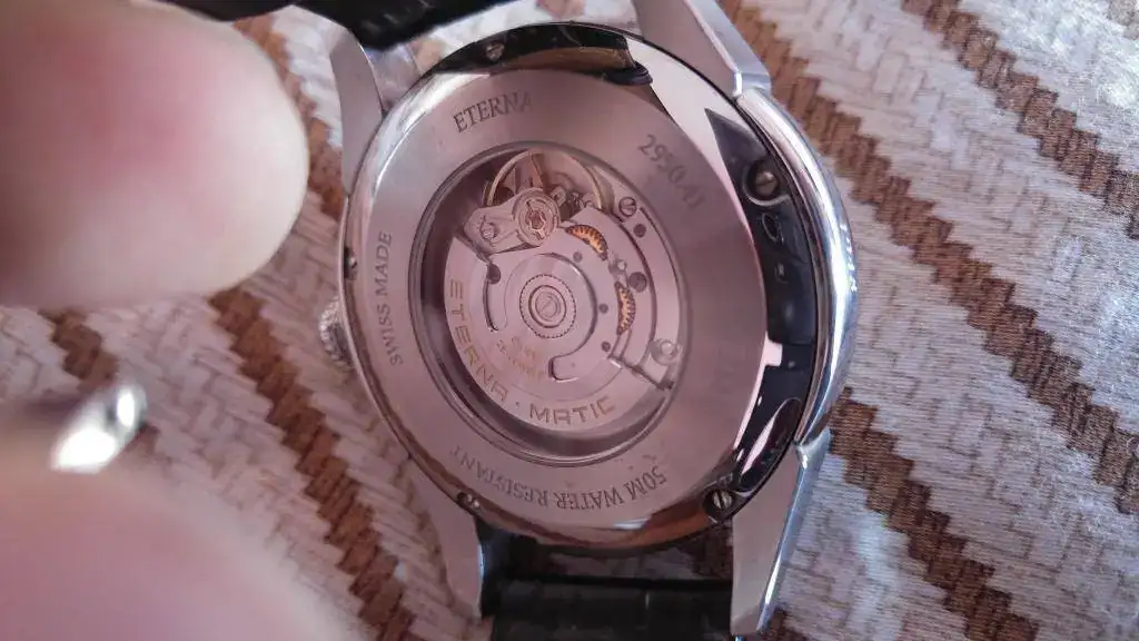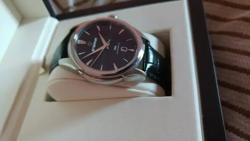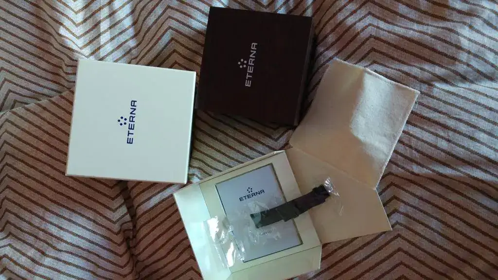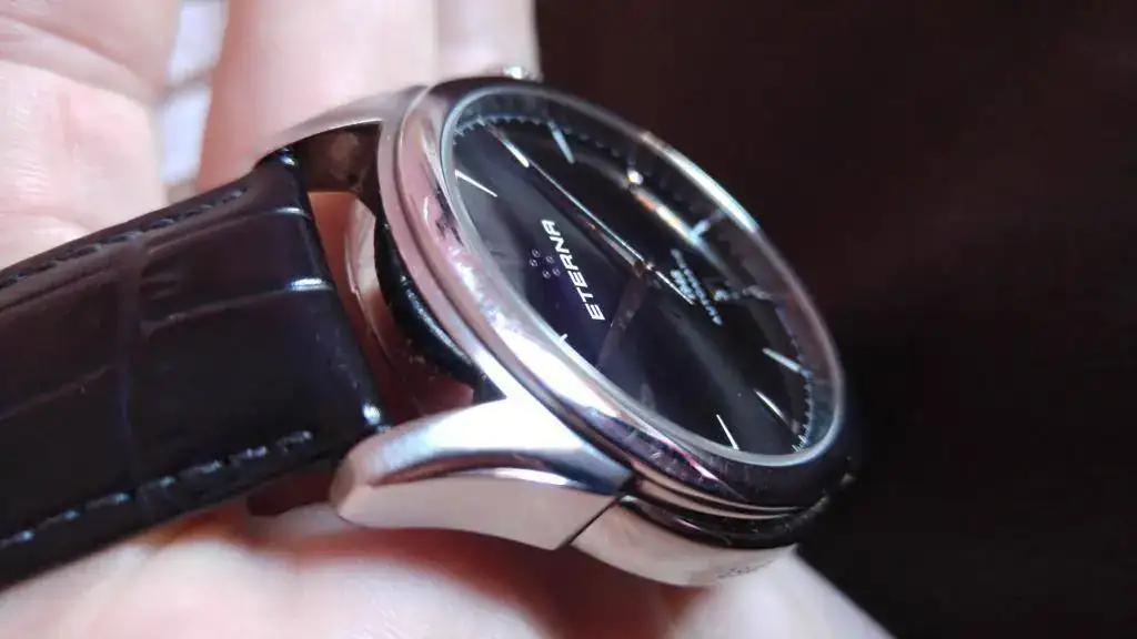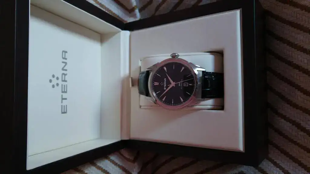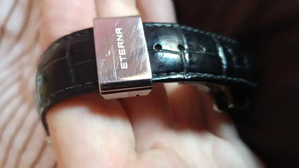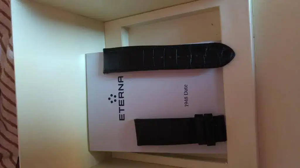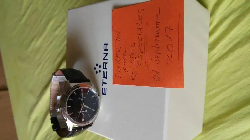 Vendo mi precioso Eterna 1948, con esfera negra, por no usarlo durante tiempo. El reloj funciona perfectamente y tiene leves señales de uso en forma de los típicos pelillos de siempre, los cuales he intentado reflejar en las fotos tomadas. El reloj lo compré nuevo en marzo del 2015 y ahora lleva una correa Hirsch grano caimán, la original de cocodrilo está guardada y se entrga junto con el reloj, por supuesto.