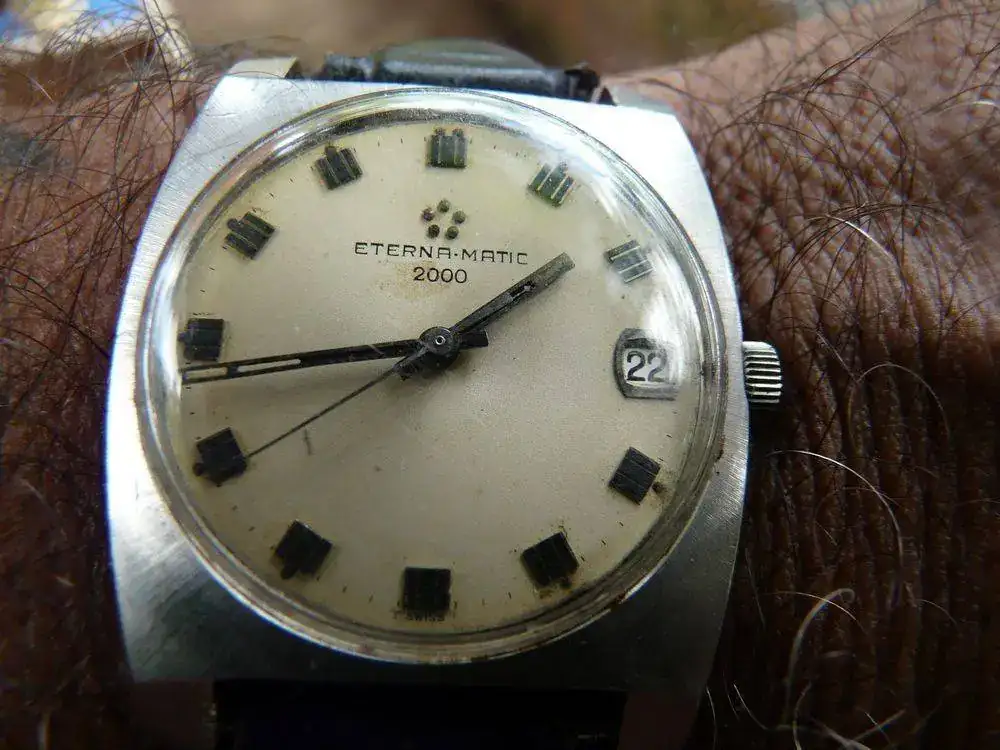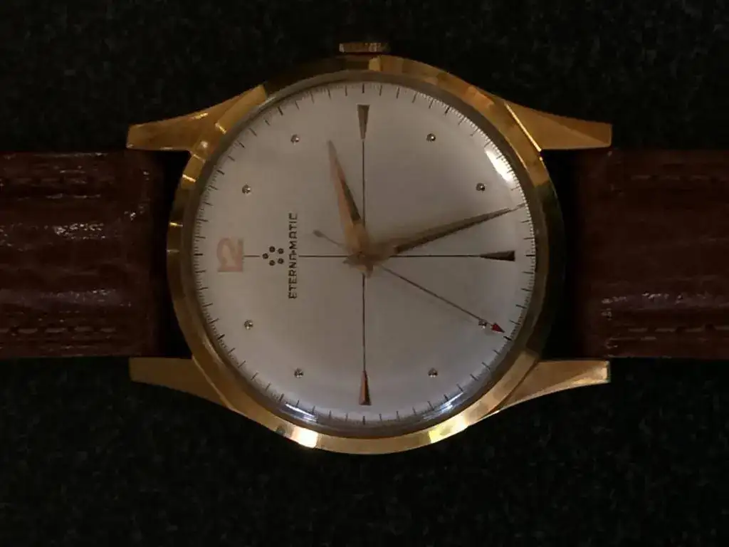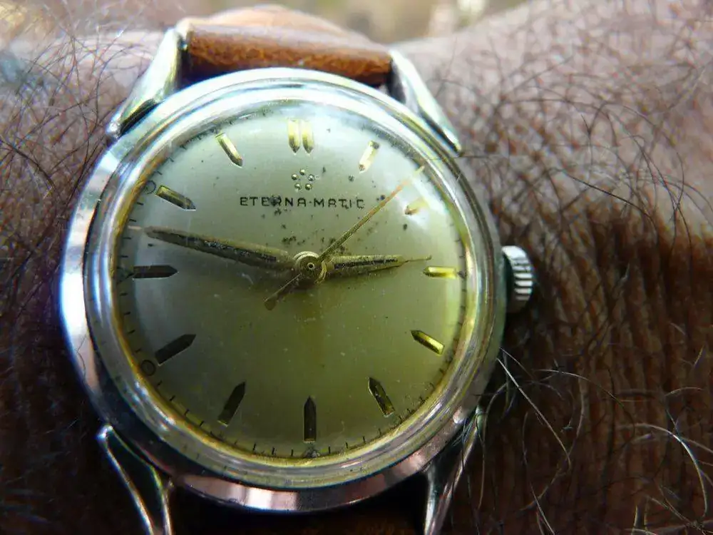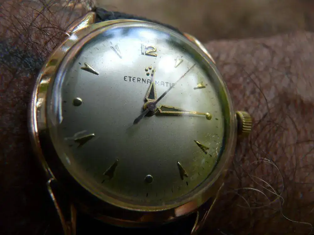 Ahora lo que nos gusta todavía más. El reloj. Empezando por el calibre que me dicen que tiene, un 1234 UC no sé... en Ranfft aparece como date y el mío es no date, aunque se ven unos cuantos no date por la red. En cualquier caso de la familia del primer reloj en la historia con rotor de bolas, que a partir de ahí se convirtió en logo de Eterna.