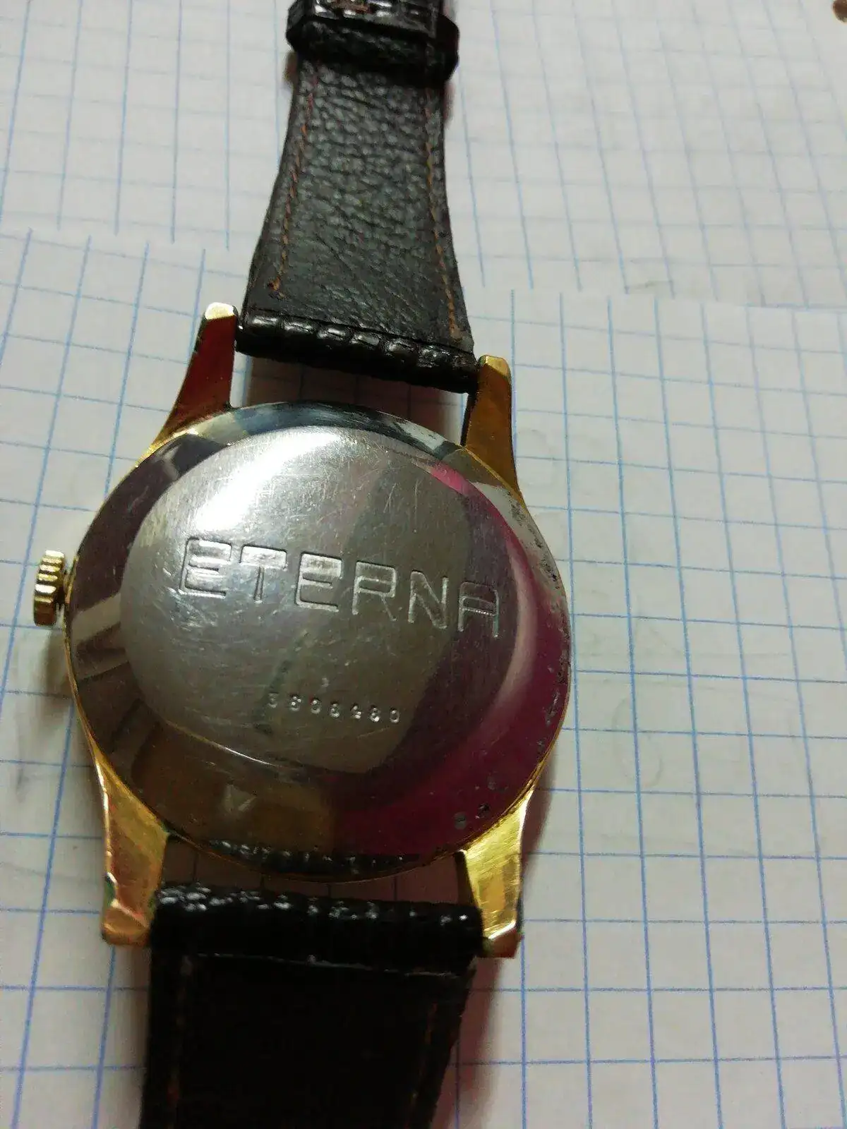 Quisiera comentar, que es un placer llevar un eterna en la muñeca, marca nada conocida por la gente,.discreto, tu satisfaccion interior de llevar puesto uno de los relojes mas maravillosos de la historia,. Te sientes afortunado, ningun reloj como este, 1950,primera serie caballero, 12xxuc, maquina perfecta, 38 mm, baño oro 20,orejas largas agujereadas, segundero en flecha, agujas gruesas, logo eterna en tapa, esfera graduada, números, puntos, puntas de lanza, rayas en cruz, la 12 presidiendo,.