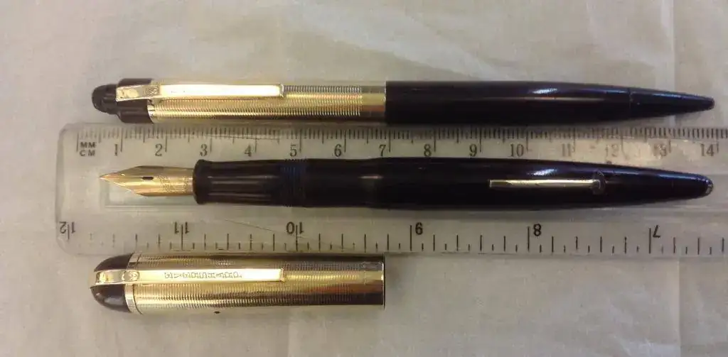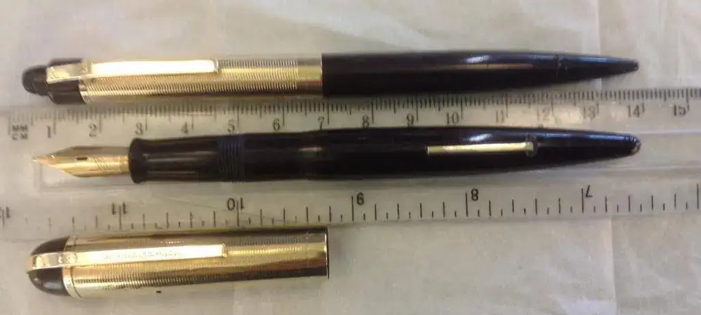Este juego está compuesto de una pluma y un lápiz (portaminas de 1,1 mm) con capuchón dorado (chapado en oro, 14k) en el tamaño standard que es, en mi opinión, el más cómodo para escribir de forma cotidiana. El color es Burdeos aunque parezca negro en las fotos.