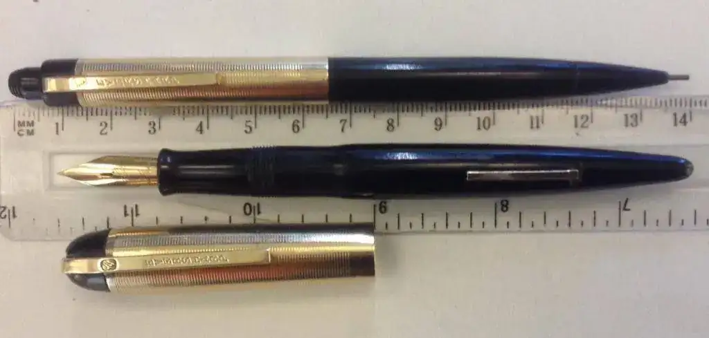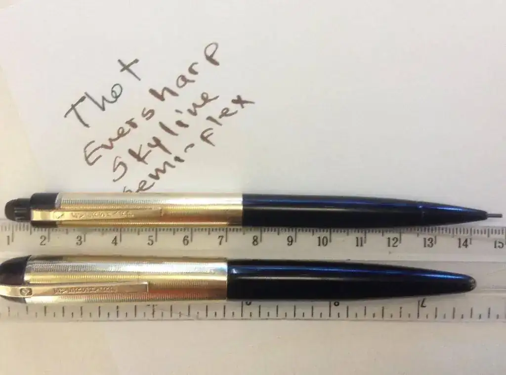 Vendo este conjunto de Eversharp Skyline que es una pequeña joya. La pluma tiene un plumín semiflexible que parte de un trazo medio como se puede apreciar en la fotografía. El saco ha sido renovado y la pluma puesta a punto por T&T en Madrid. El color del cuerpo es negro lo que junto al capuchón chapado en oro, lo hace uno de los conjuntos más clásicos de Eversharp en este modelo. El lápiz esta muy bien balanceado y es ligero. Su mina de 1,18 es fuerte y acompaño un recambio de esta medida un tanto especial.