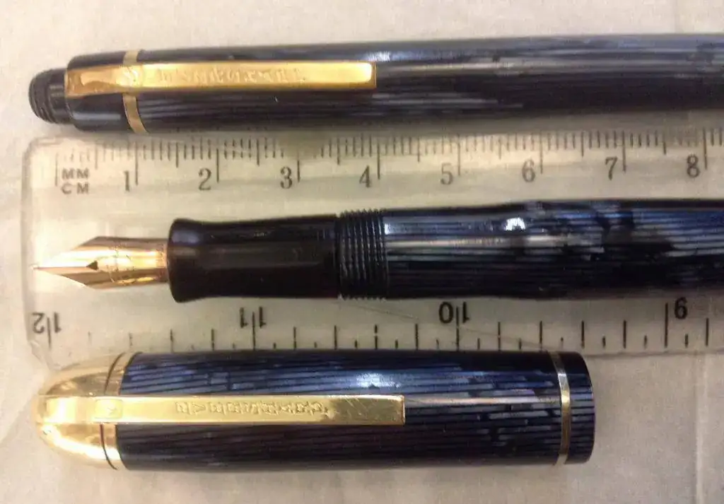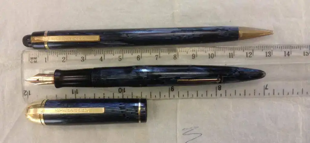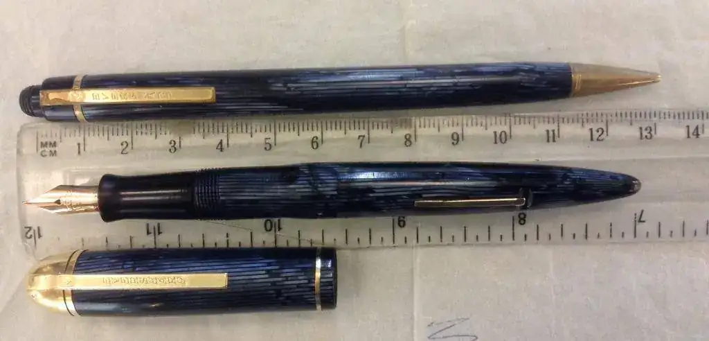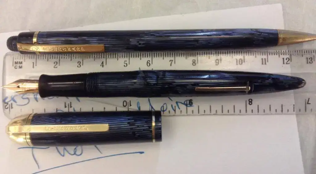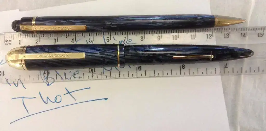 Vendo una de las joyas de la corona de mi colección. En este caso es un conjunto de pluma estilográfica y de portaminas de Eversharp, el modelo Skyline, tamaño Standard y color Blue Moire. La pluma y el portaminas están en perfecto estado tanto estético como funcional. La pluma ha sido revisada recientemente y se le ha cambiado el saco. Los dos han sido usados por mí durante años y puedo dar fe de la comodidad de su diseño y la fiabilidad en el día a día. El plumín es fino. El grosor del lápiz es de 1.1 mm. Adjunto un par de minas de recambio. Este conjunto fue fabricado en celuloide y en Blue Moire, color muy difícil de conseguir y, mucho menos, en este estado.
