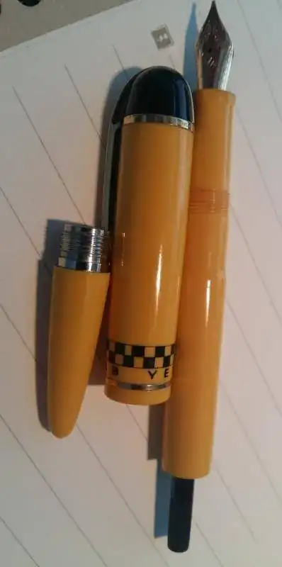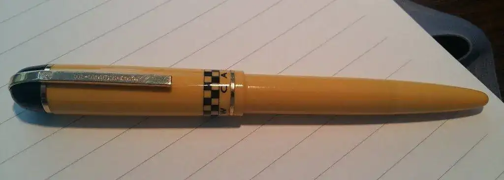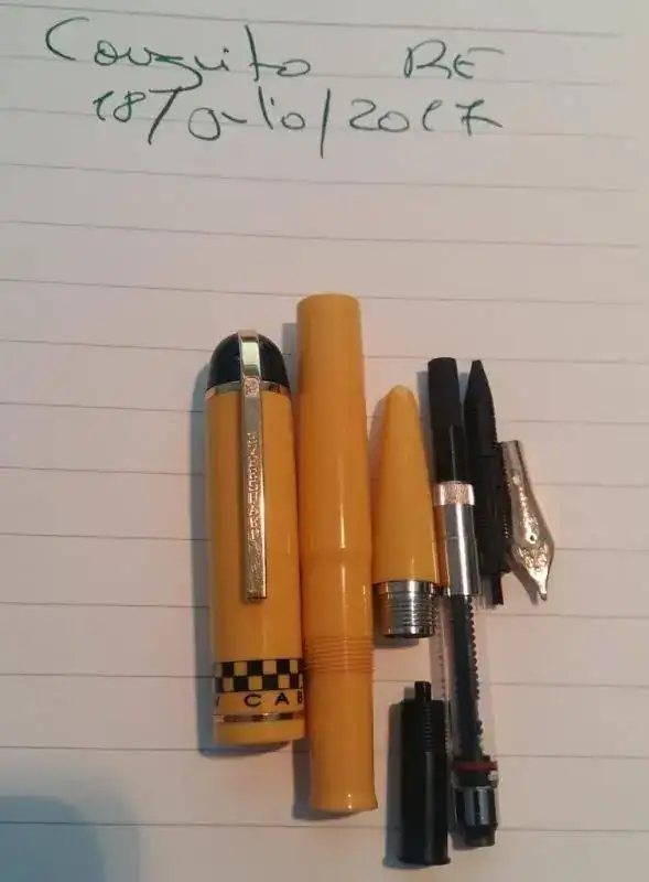 A la venta esta estilográfica EVERSHARP modelo Skyline Yellow Cab. Únicamente se entrega la estilográfica, sin caja. Lleva Plumín de oro 14k, punto M, que va enroscado junto con el alimentador (en las fotos se puede ver desmontada, es bastante sencillo). Cuerpo y capuchón de resina solida amarilla. Longitud 127 mm. El convertidor que lleva es de Waterman, que encaja perfectamente. La compré de segunda mano, usada, aunque yo sólo la he probado un par de veces y acabó en el cajón. Le pongo un precio de 60€, envío incluido. Mediante Correo certificado con número de seguimiento. Unas fotos:
