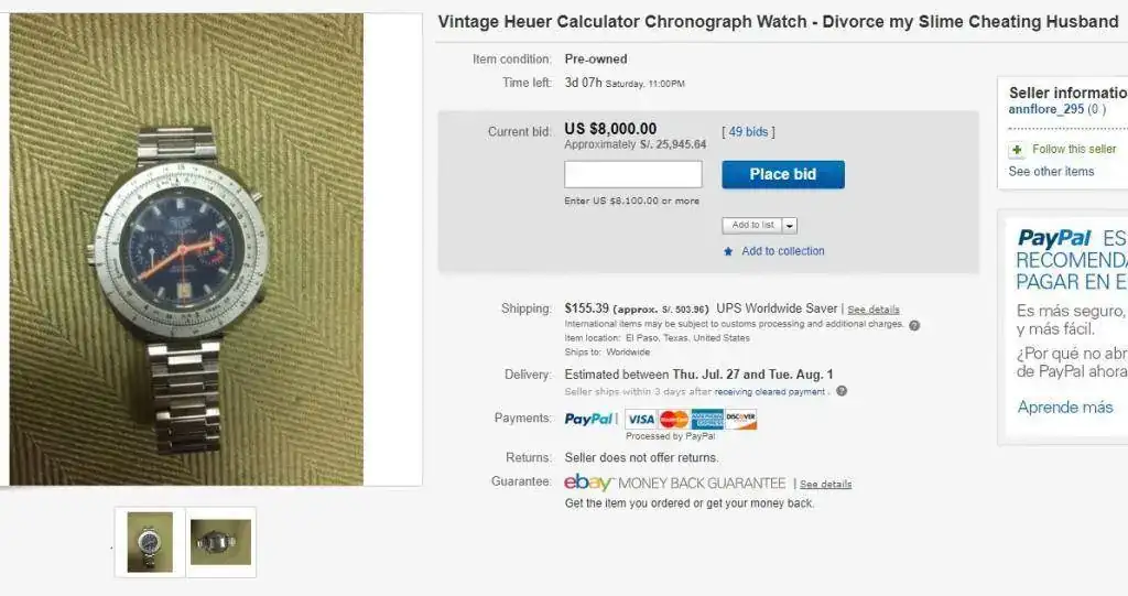 Estimados, sin ánimo de ser amarillista, acabo de leer una noticia que me ha dejado pasmado, al hecho: Una mujer se enteró en una reunión que su esposo la engañaba, ahora, al parecer ha tomado algunos relojes (no indica cuántos) de la colección del señor y lo va a poner en la bahía, por lo pronto solamente hay un Heuer, pero indica que subirá más.