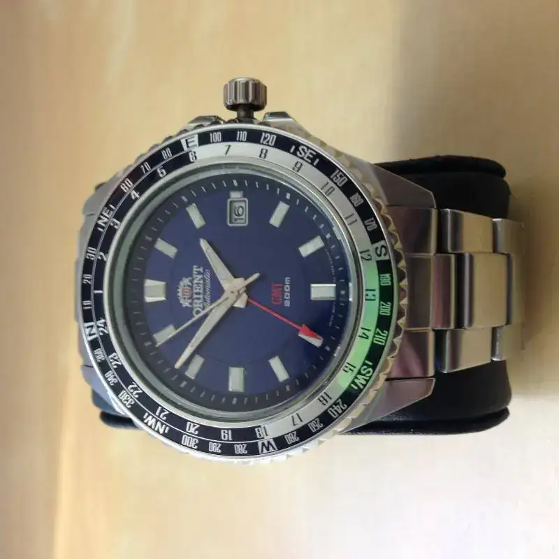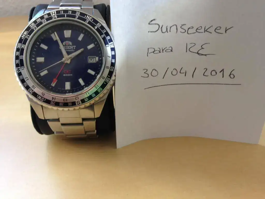· El anillo giratorio con indicador de 24 horas para la función GMT (función de hora dual), metálica en dos tonos.