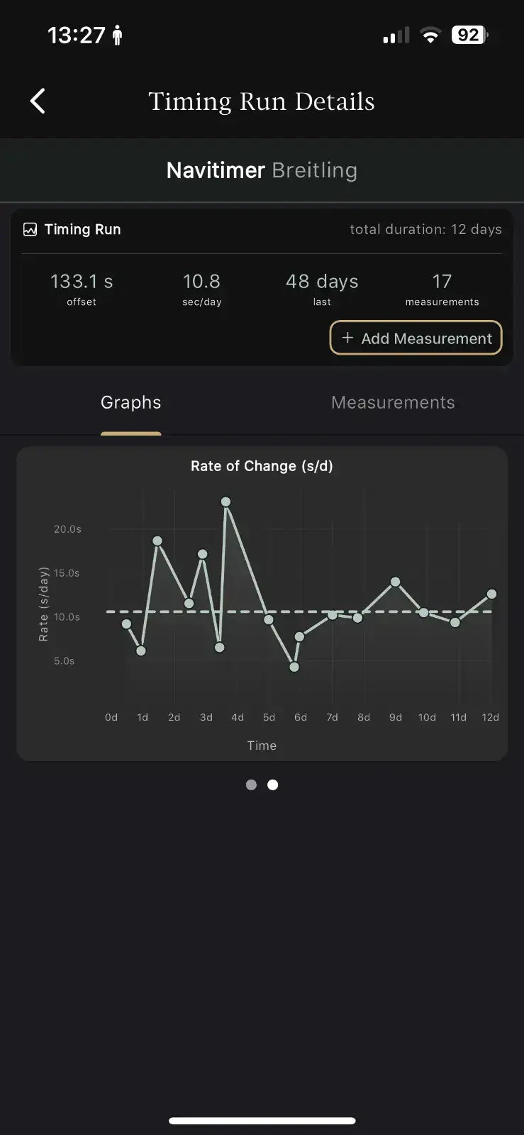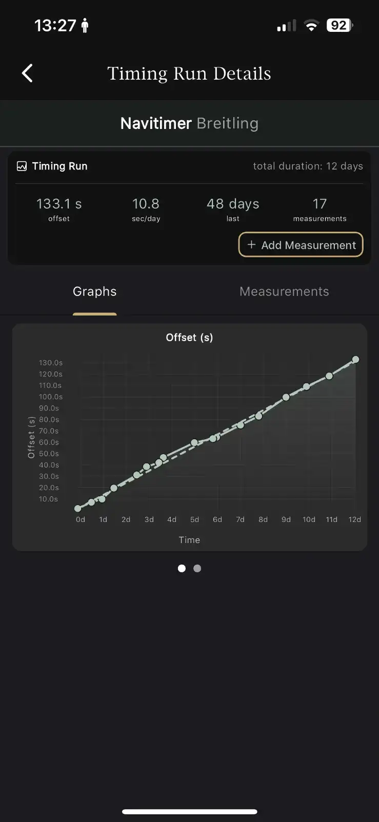 Todo comenzó a finales de Enero cuando encontré un Breitling Navitimer 41 A13324 por un precio relativamente atractivo en una Boutique. Decidí comprarlo y empezó la fase de luna de miel que todo aficionado experimenta cuando adquiere una pieza que le satisface. A los 15 días aproximadamente empecé a notar que el reloj se adelantaba considerablemente a lo que yo esperaba para un reloj con certificado COSC asique empecé a tomar mediciones con la App Chrono Log (app que uso para llevar más o menos a raya todos mis relojes).