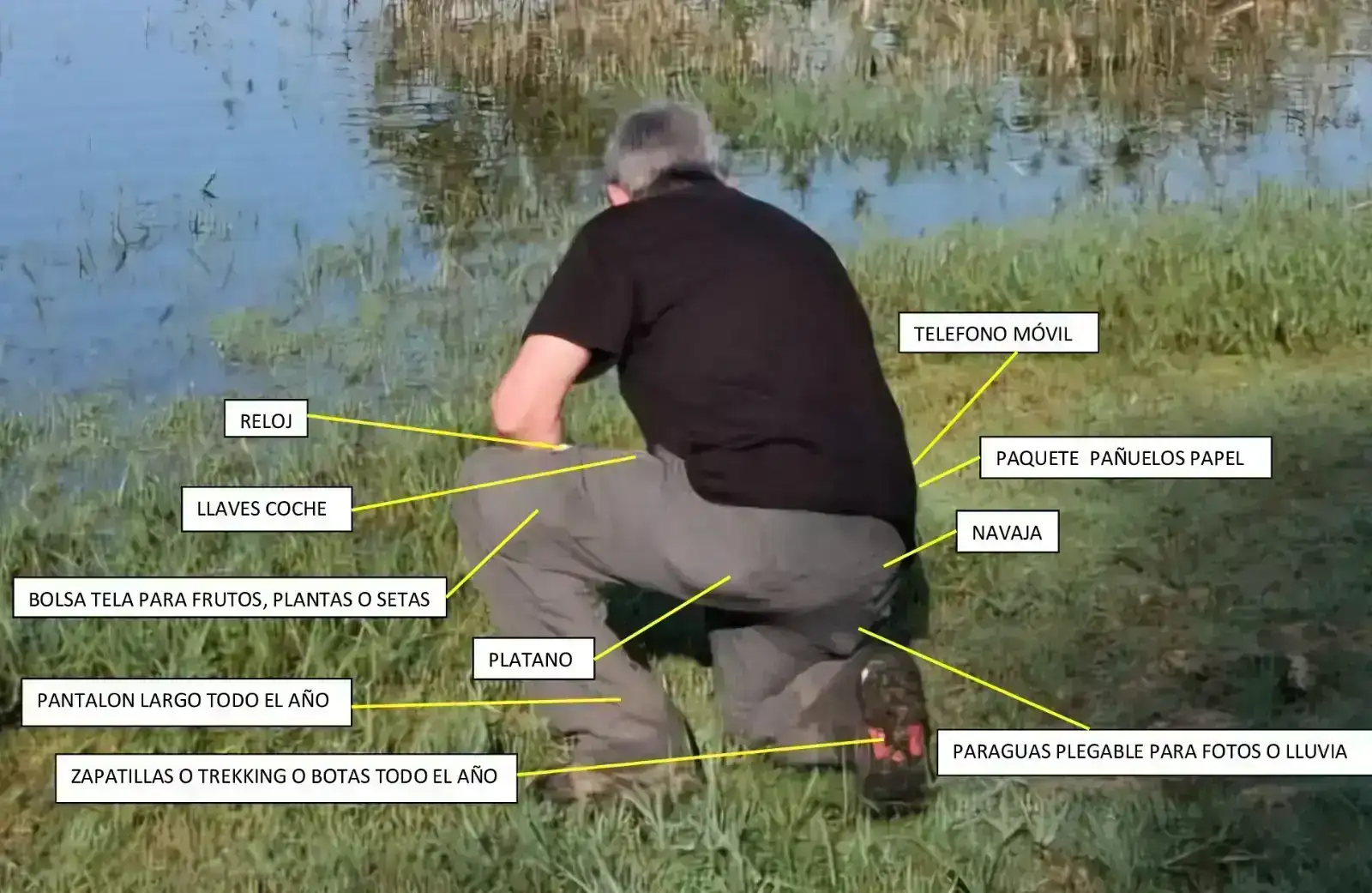 Una mochilita, para meter todo eso. Menos el pantalón, zapatillas y camiseta.Ayer buscando bichitos en uno de mis lugares preferidos me hice una auto-foto y al verla me di cuenta que se notaban varias bultitos en los bolsillos, bueno pues ese es el equipamiento que llevo todo el año, aparte de ropa de abrigo en otoño o invierno para mis salidas bicheras/camperas. y en algunas ocasiones un bastón de madera para terrenos complicados o seteros.
