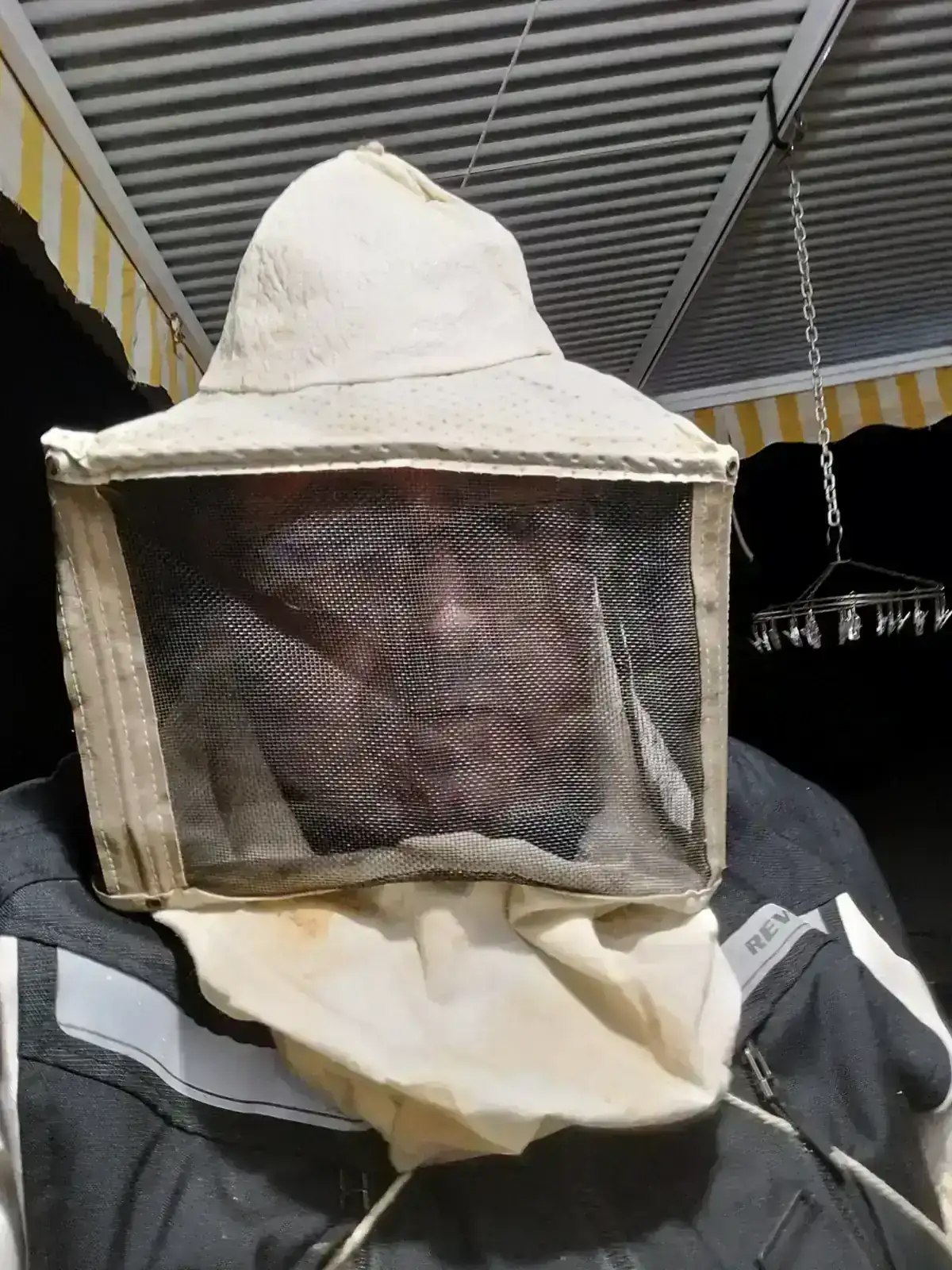 Pensando en su fuerza y la longitud de su aguijón estuve tiempo escogiendo prendas para protegerme. Del equipo de apicultor de cuando me dio la afición hace más de cuarenta años solo me quedaba medio viable la careta. El resto lo complementé con ropa de moto y guantes anti pinchazo del trabajo.