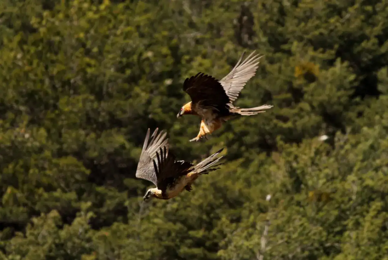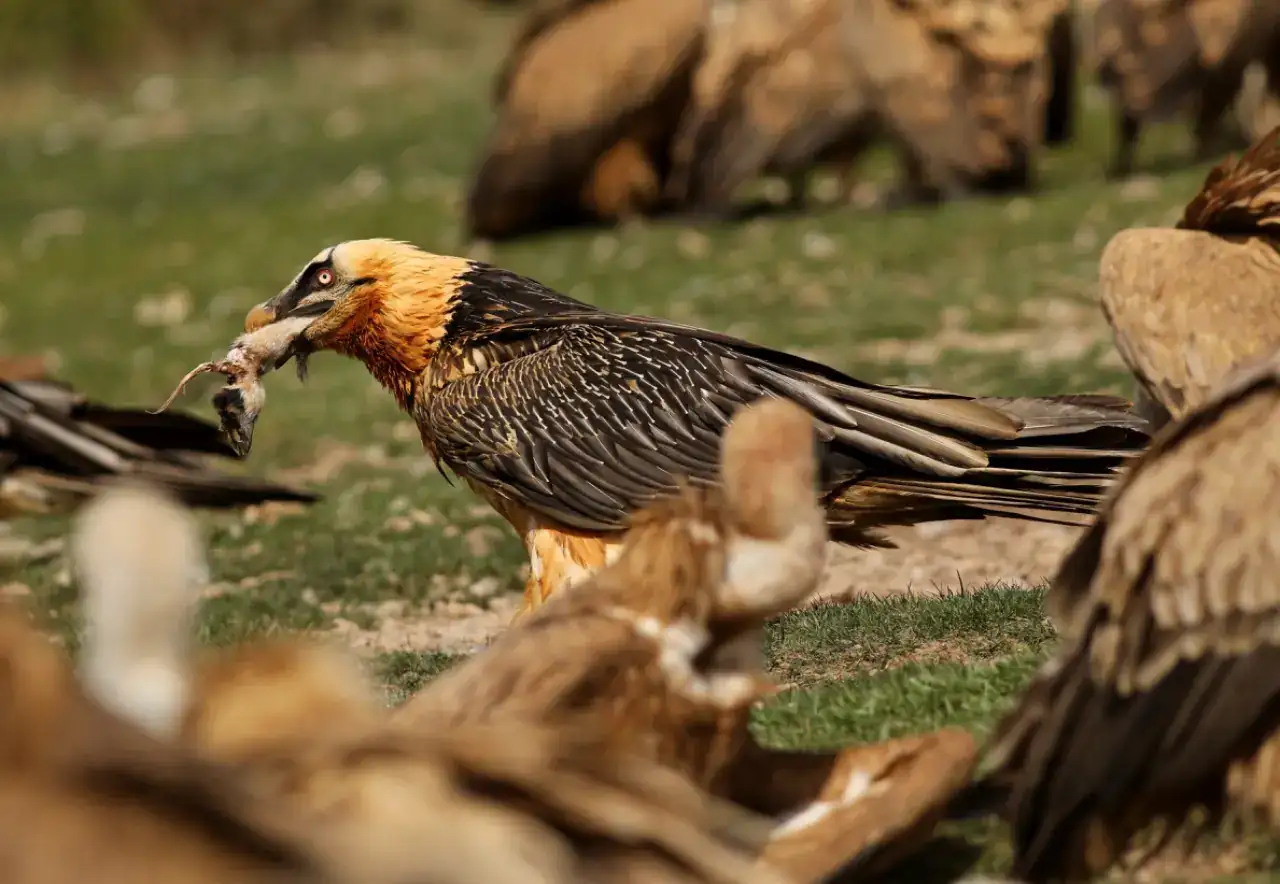 Los primeros en venir a comer son los buitres y luego cuando ya solo quedan huesos aparecen los quebrantahuesos, un verdadero espectáculo de la naturaleza.