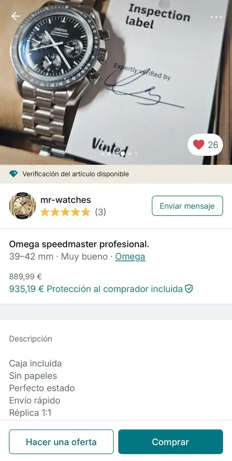 Pues hoy más de lo mismo… con un Omega en el que el vendedor, en la descripción, dice que es una réplica, y no sólo eso, en una de las fotos que pone aparece la firma de estar verificado por Vinted!!! Cómo no denuncio, y me dicen que no incumple!!! Me parto 🤣