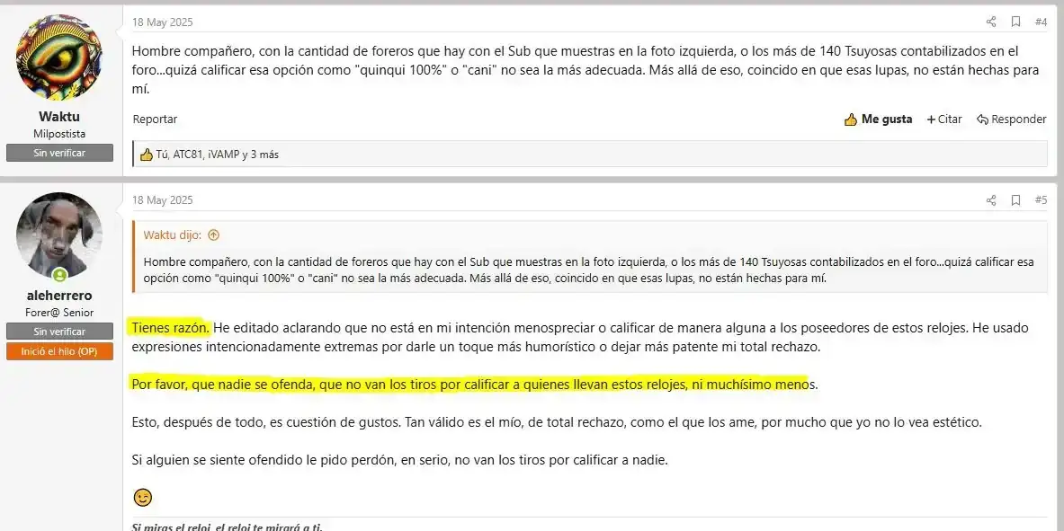 Yo no te sigo y espero que no te ofendas pero en el hilo que abriste de los cíclopes también te dirigías a las personas/relojes que llevan lupa como canis y horteras. No se si es la mejor manera de crear un ambiente sano y cordial