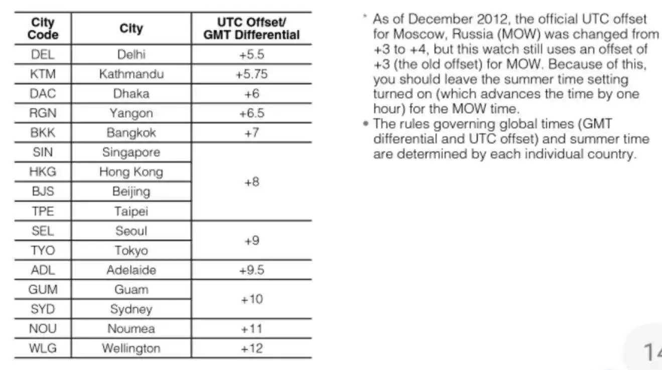 Esto puede pasar, incluso, para las diferencias horarias con respecto a UTC de los distintos países, si sufriesen cambios. Por ejemplo, fijaos en la aclaración en la siguiente tabla correspondiente a un Casio Rangeman, bien conocido en el foro: